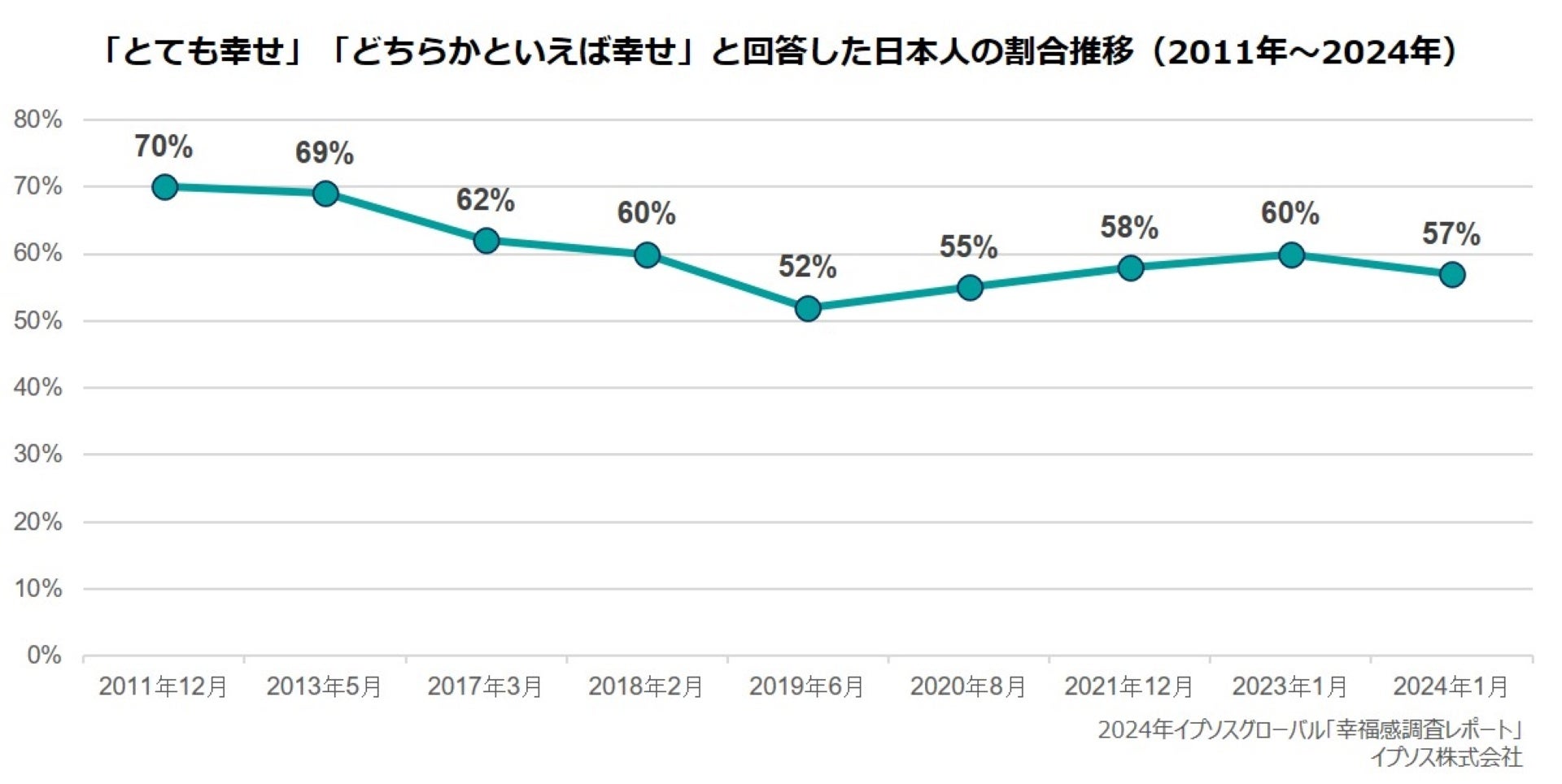 「幸せである」と回答した日本人は57%で13年前より13%減少し、30カ国中27位の結果。