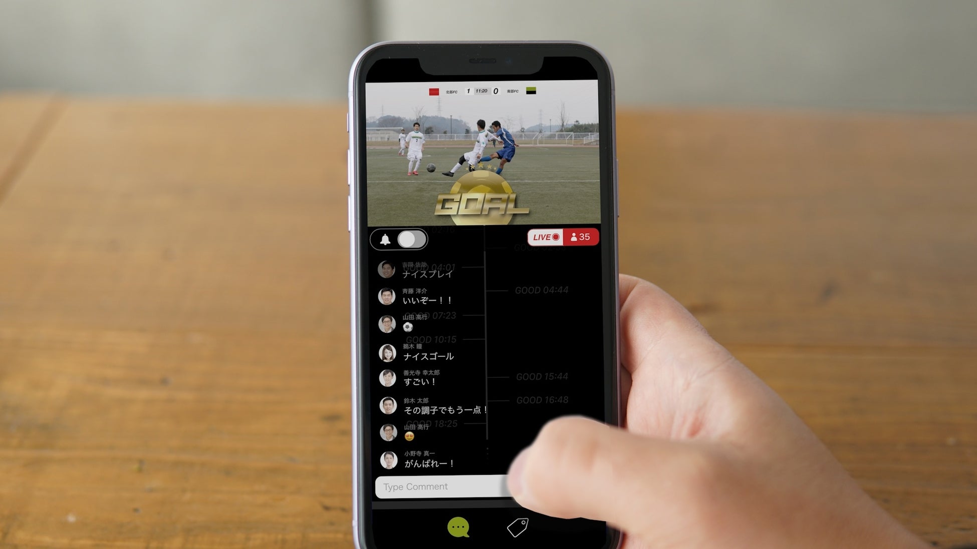 BEYONDOのカメラ機能で試合を撮りながらタグをつければ、スコアやゴールアニメーションがついたライブ映像が配信できます。配信中に一時停止やミュートする事も可能です。