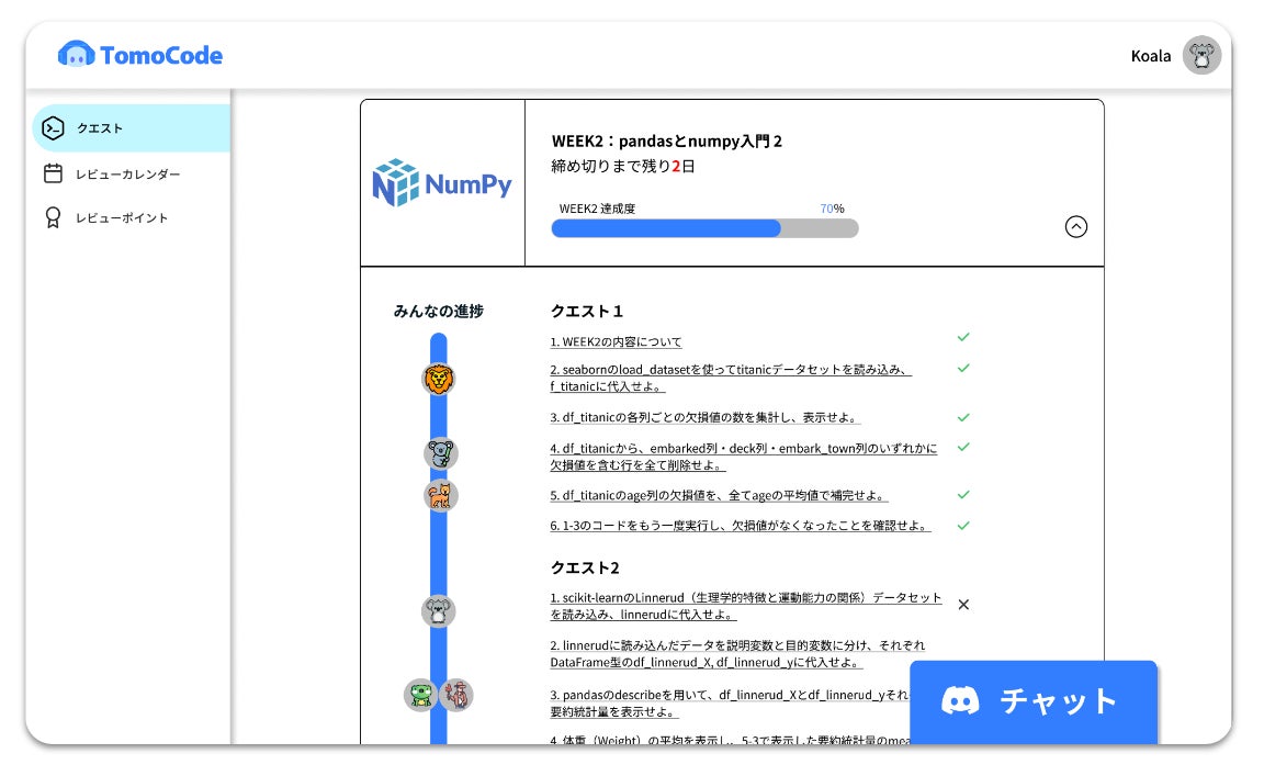 - ピアレビュー:画面共有・ボイスチャットを活用してピア同士でレビューを行うことにより、難易度の高いクエストの解決や、新たな気づきの発見に繋がります。