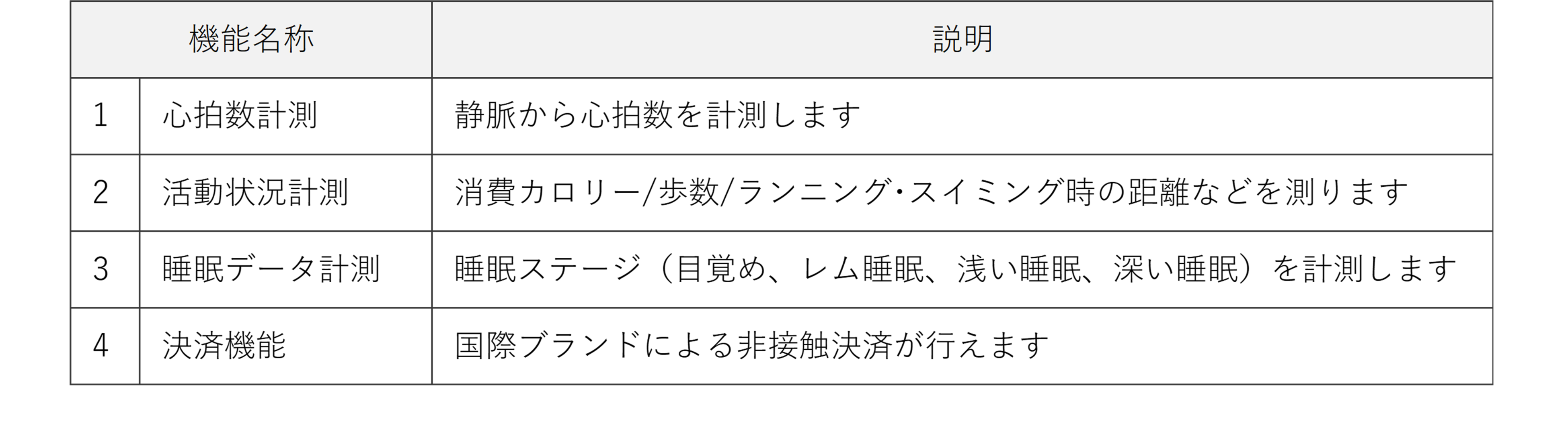 国際ブランド認定チップを実装することによる決済機能に加えて、心拍、睡眠、日々の活動状況を管理することができるリング型のウェアラブルデバイスです。