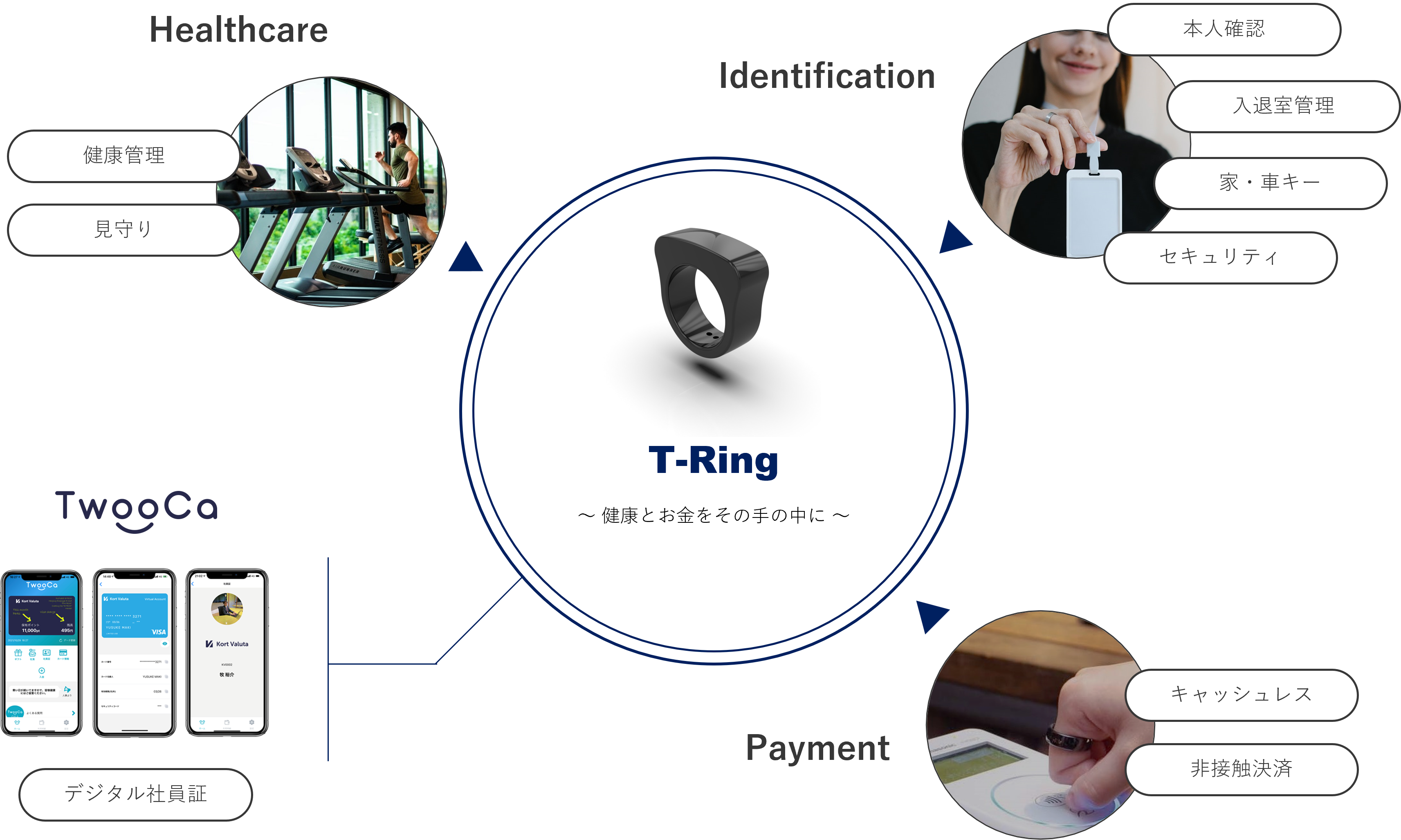 決済機能付きデジタル社員証「TwooCa」を運営している株式会社Kort Valuta(本社:東京都目黒区、代表取締役 柴田秀樹 以下KV)は決済機能と心拍数、睡眠などのヘルスケアデータの取得が同時に出来るスマートリング「TwooCa Ring:T-Ring(仮称)」の開発を開始したことをお知らせいたします。リングには国際ブランド認定チップを実装予定で、日本のみならず世界中のお店で利用が可能になります。決済とヘルスケア機能を併せ持つリング開発は日本国内において初の試みではないかと思います。