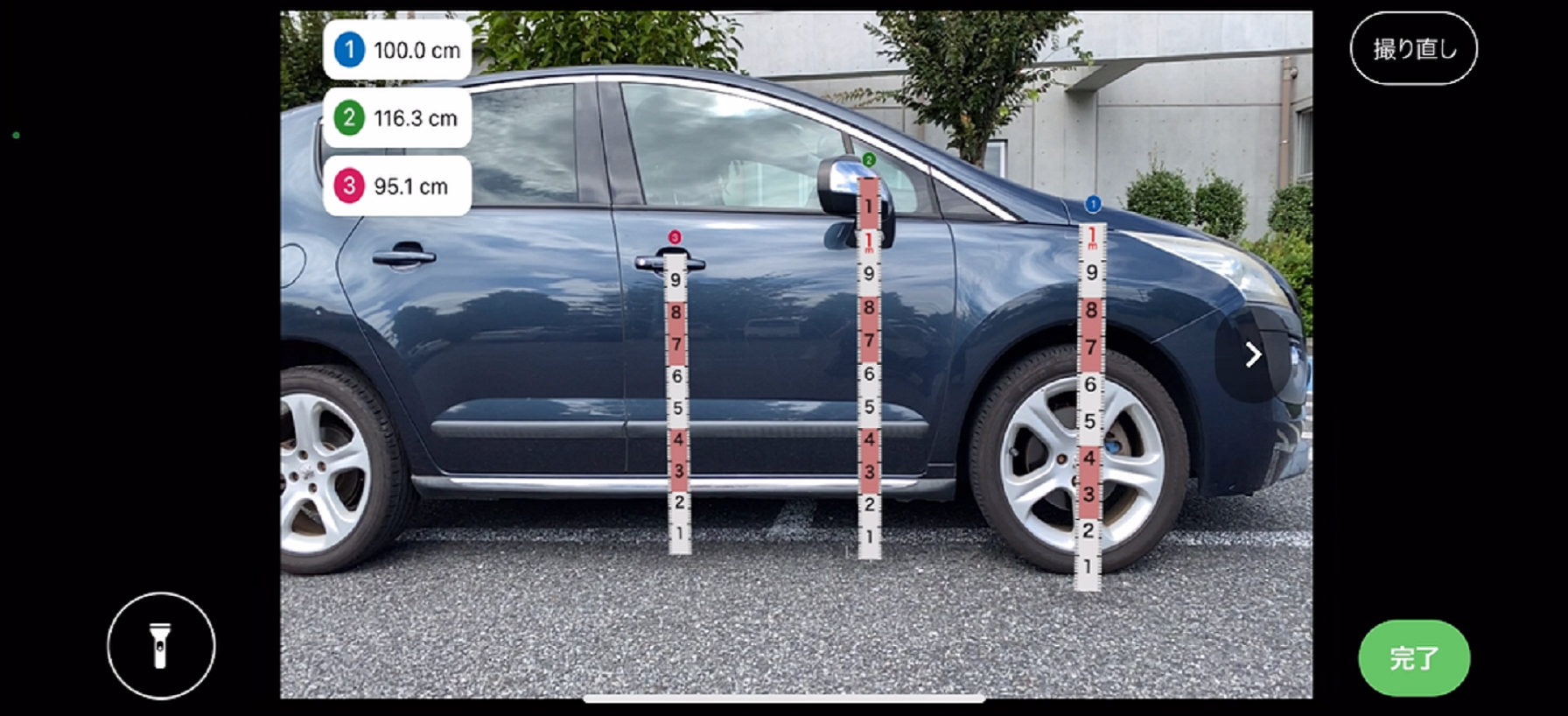事故車の撮影をする際にアプリ上の「高さ測定」をタップすることで、仮想のメジャーがアプリ画面上に表示され、損傷個所の高さを計測することができるようになります。また、実際の事故車と一緒にメジャーを表示させた画像を保存することで、自動車修理工場と損害保険会社・共済組合(以下損保・共済)間で事故車の写真および見積りの送信が行えるプラットフォーム「コグニフォトベース」へ送信することも可能です。
