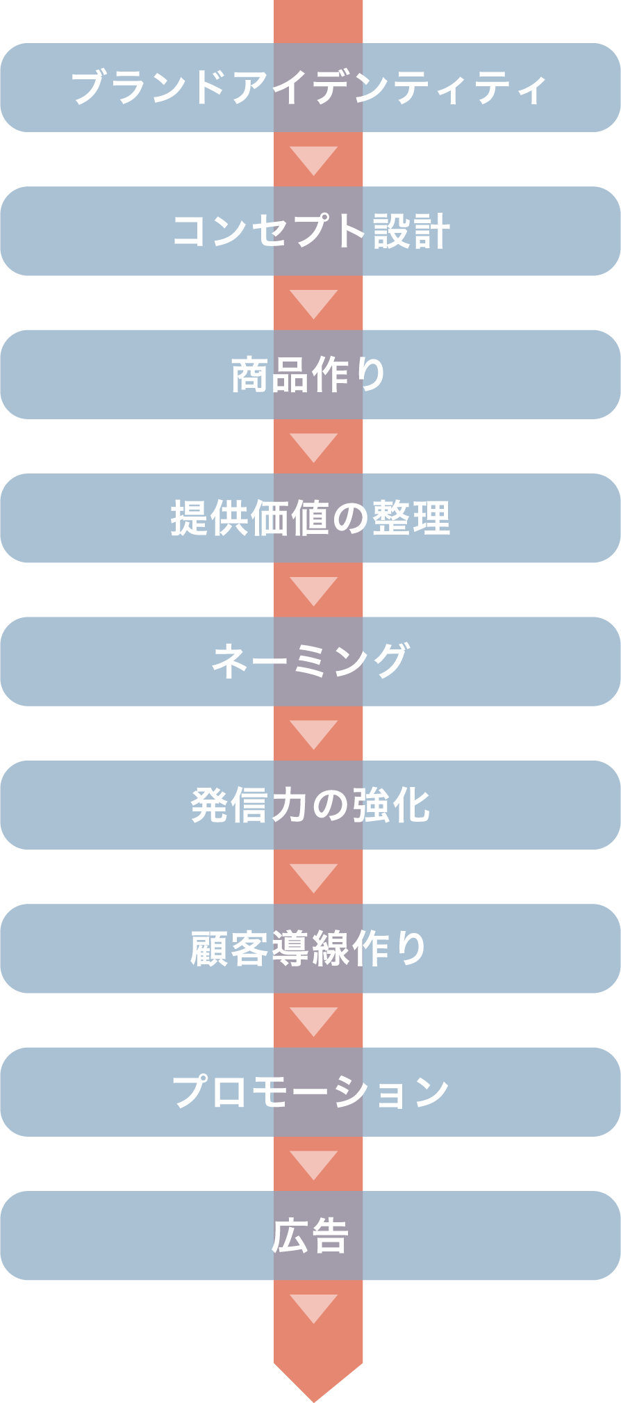 上記のような課題解決のためには強いブランドを作る必要があり、マーケティング活動の全てのフェーズにおいてブランディングの視点が欠かせません。マーケティング活動にブランディングを取り入れ一気通貫させていくと、
