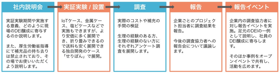 LAQDAプロジェクトは、生理用品の設置を行う過程での合意形成を重視したプログラムを行っています。プログラムを一連して行うことが継続的な設置や関係者のDEI醸成に寄与すると考えており、以下プロセスで実施しています。
