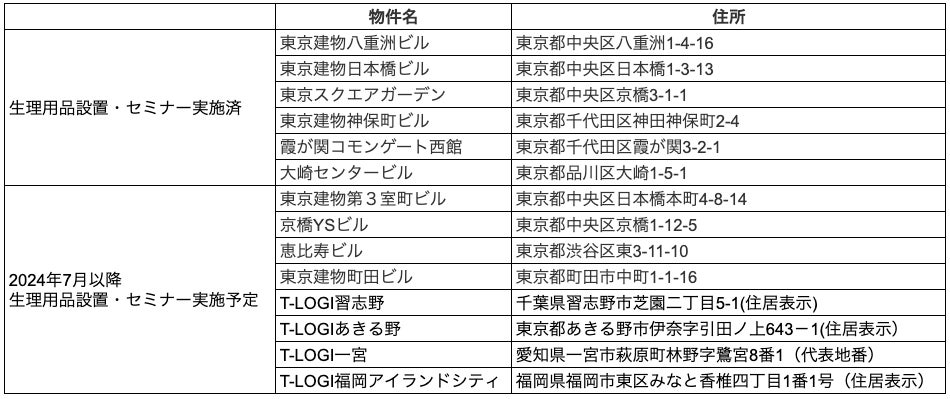 現在設置が完了しているオフィスビル6棟のほか、7月からは東京建物株式会社、東京不動産管理株式会社、東京ビルサービス株式会社が所有し管理管理運営するビル4棟のほか、物流施設4棟で設置します。今後は、これらの合計14棟での生理用品設置・セミナー展開を進め、順次、全国のオフィスビルに拡大していく予定です。