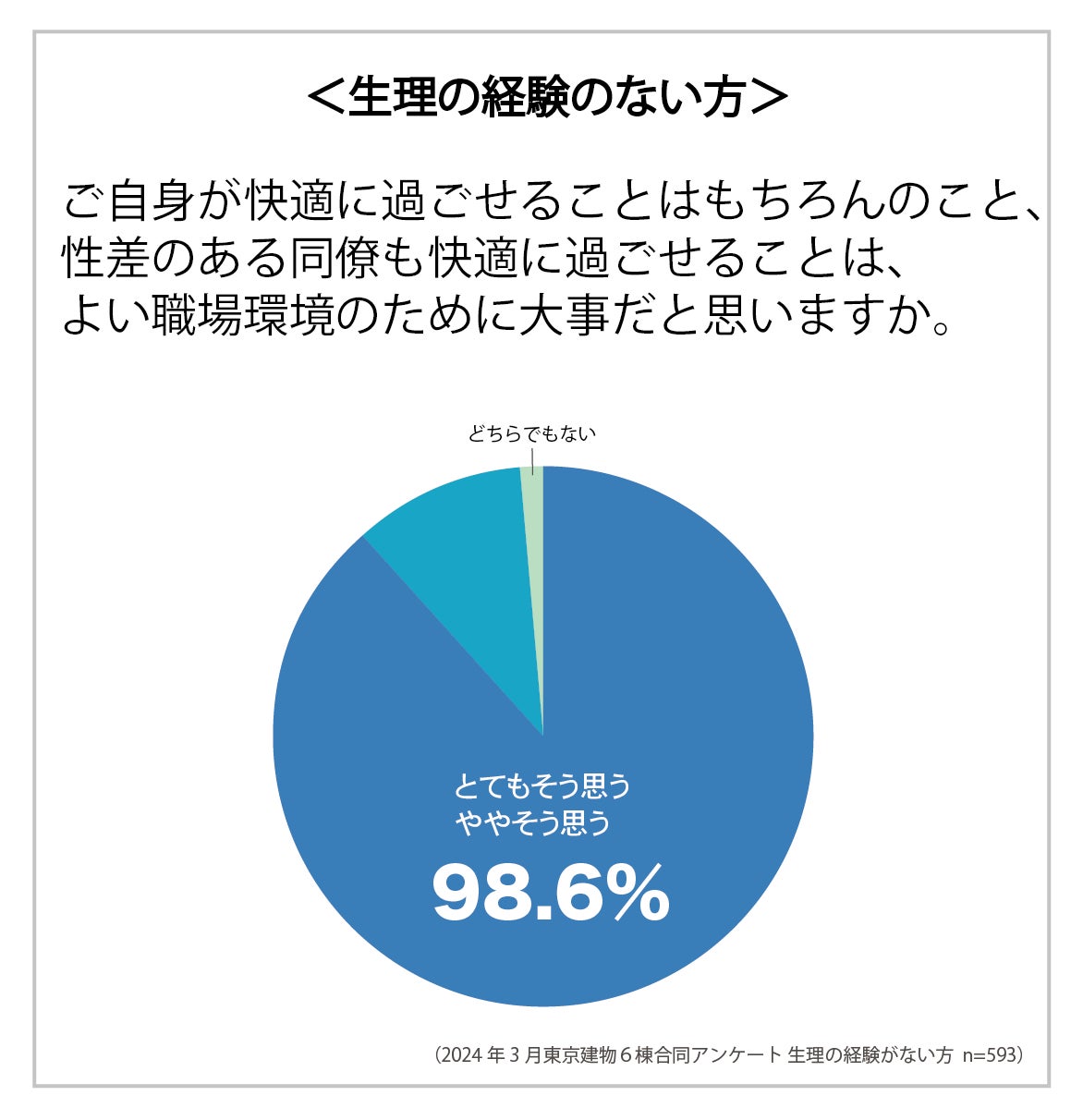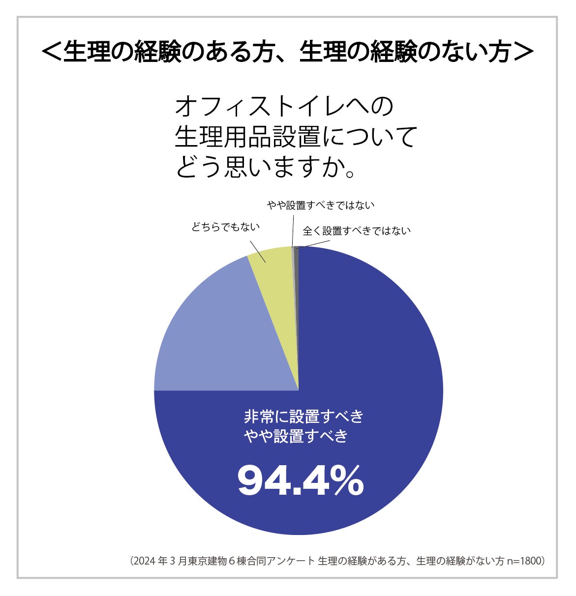 オフィストイレへの生理用品設置の取り組みは、テナント企業にも注目されており、大変好評いただいております。今年3月に6棟合同の調査を行ったところ、生理の経験がない方も含め1800名の方がアンケートに回答いただきましたので、結果をお知らせします。
