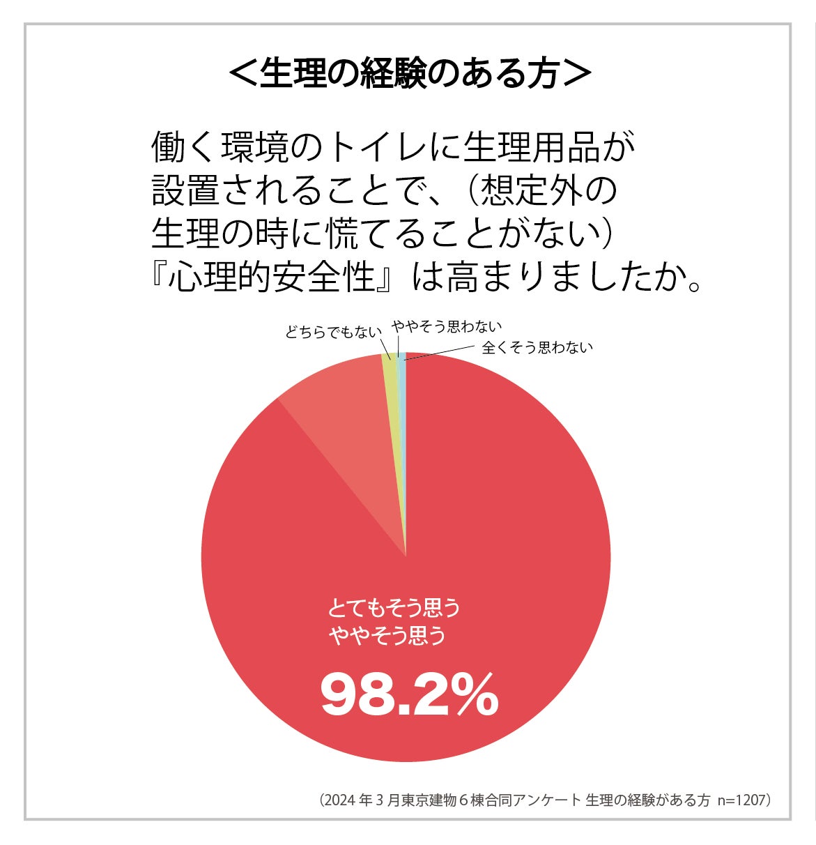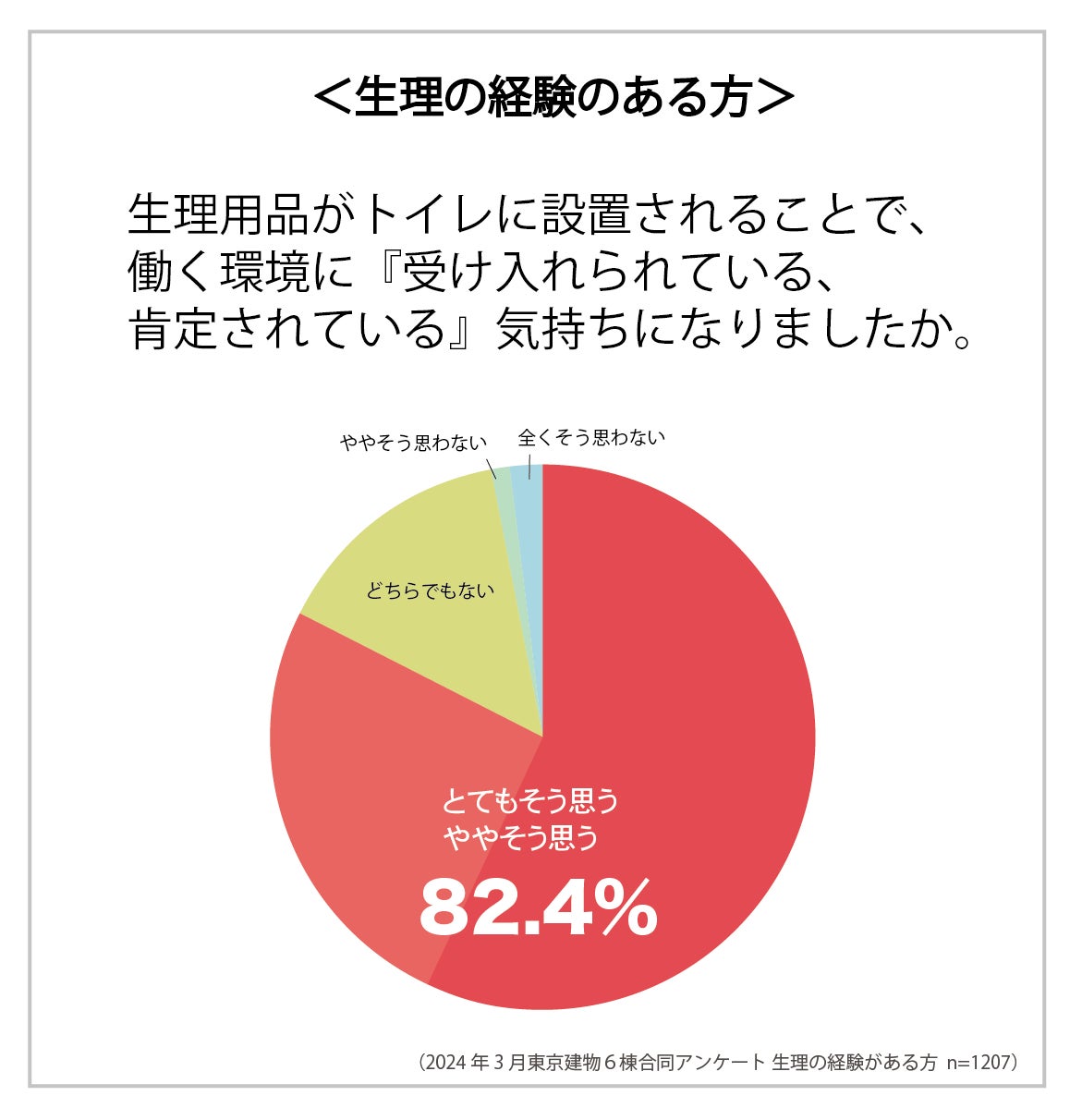オフィストイレの生理用品設置で「心理的安全性が高まった」方は98%。「働く環境に『受け入れられている、肯定されている』気持ちになった」方は82%。働く方の自己受容やインクルージョンにも貢献。