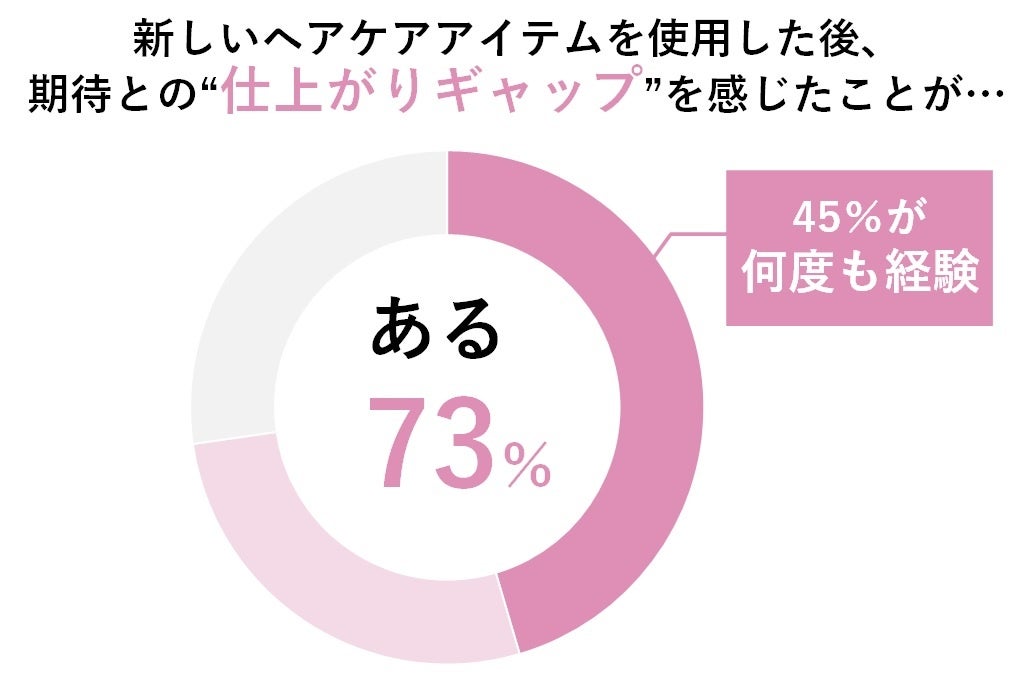 まず、新しいヘアケアアイテムを使用した後の髪の仕上がりについて、 “仕上がりギャップ”を感じたことがあるかどうかを聞くと、7割超が「ある」と回答しました。さらに、そのうち45%の人は「何度も感じたことがある」と答えています。