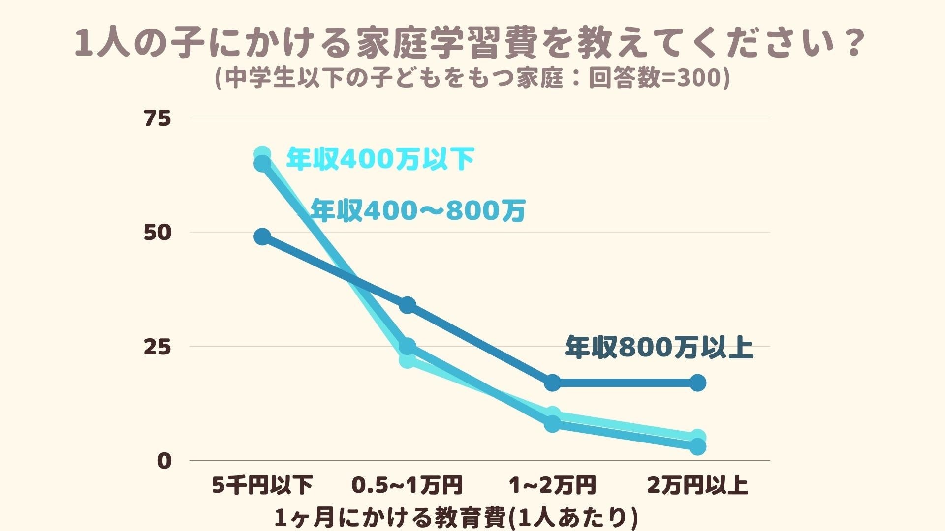 世帯収入400万円以下でも、世帯収入800万円でも教育費の絶対値に変化はなく、教育費に投資できない環境は変わらないと推測します。これは、多少の政策・経済環境で収入が増えても教育費が増えない可能性があることを示唆しています。