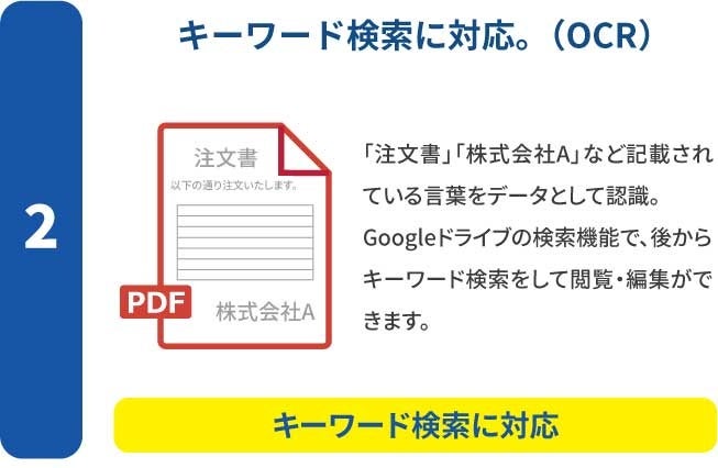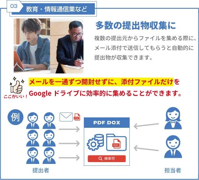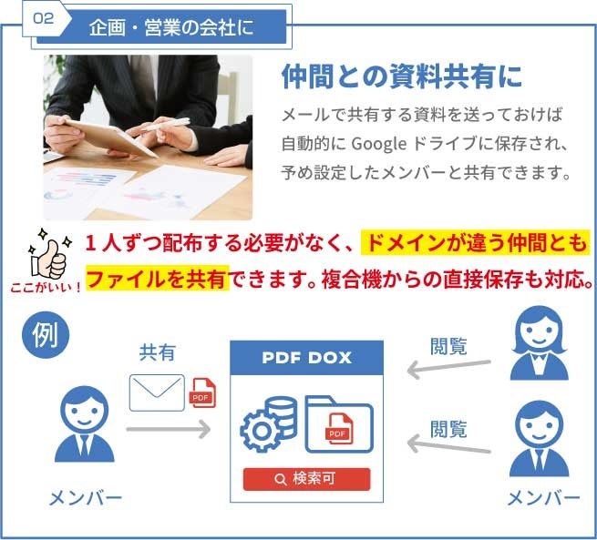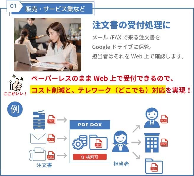 たとえば、PDFファイルやFAX送信で「注文書」を受付けている事業者を例にすると、取引先からメール・FAXで届いた「注文書」をPDF DOXにつながるメールアドレスへ送信または転送すると、自動でGoogleドライブの指定フォルダに保存されます。この環境により、注文書を仕分けする人と納品手配をする担当者が別の場所にいても業務に対応できます。