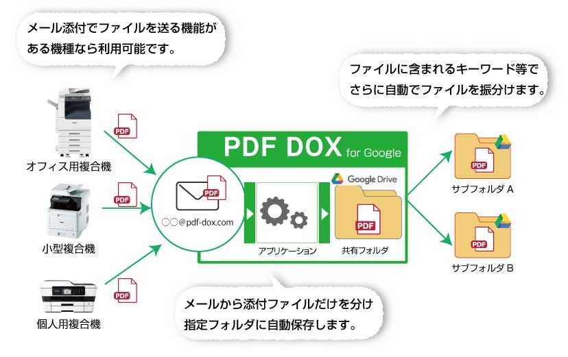 本製品は、PDFファイルやその他のデータファイルをメールから直接Googleドライブに自動保存し、