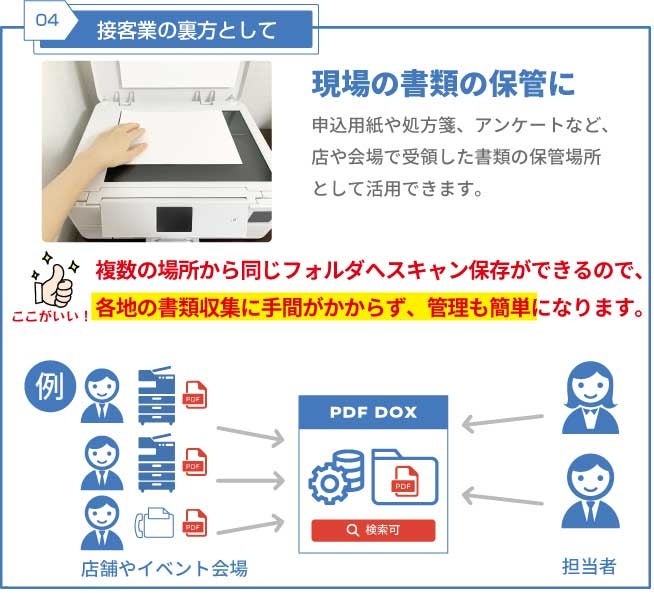 PDF DOXは、メールで送信されるファイルの自動保存に加え、複合機でスキャンした画像データの自動保存にも対応しています。スキャンデータをメールで転送できる機能を持つ複合機であれば、業務用の大型機から小型の個人向け複合機まで幅広く対応可能です。送付先としてPDF DOXの指定アドレスを設定するだけで、複数の場所から簡単にファイルを送信できるため、多拠点でのファイル収集にも非常に便利です。