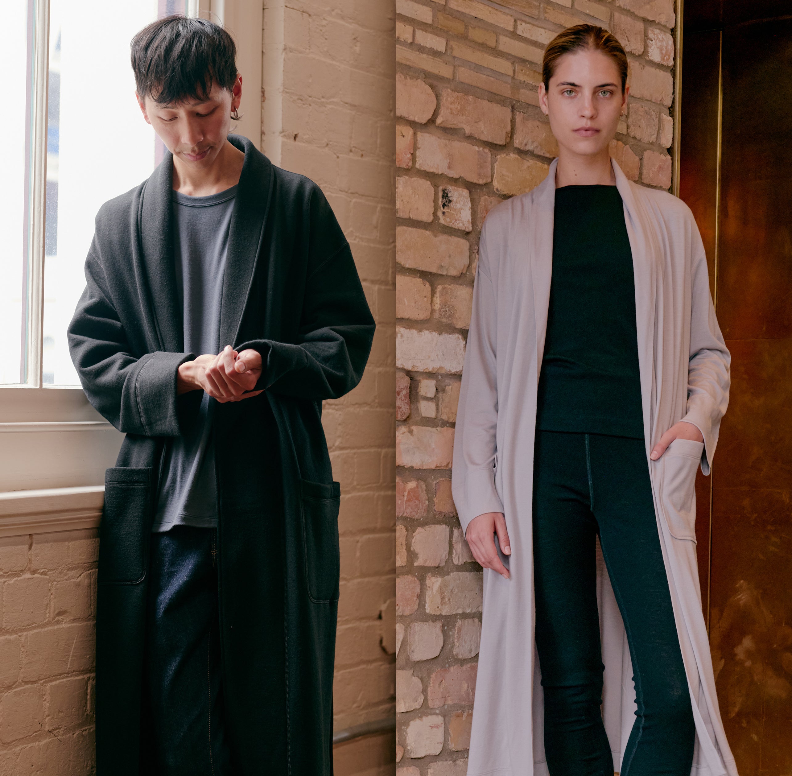 良い睡眠には、日中の緊張を解きほぐし、心身をリラックスさせることが大切と考えています。メリノ・ガウンは、お風呂上がりから就寝までの時間を、メリノウールの心地よさで包み込むことで、スムーズで深い眠りへと誘います。季節や好みに合わせて選べるよう、生地は2種類をご用意しました。家でのリラックスタイムはもちろん、ちょっとした外出にも馴染むデザイン。夜のひとときを整える、贅沢な一着です。