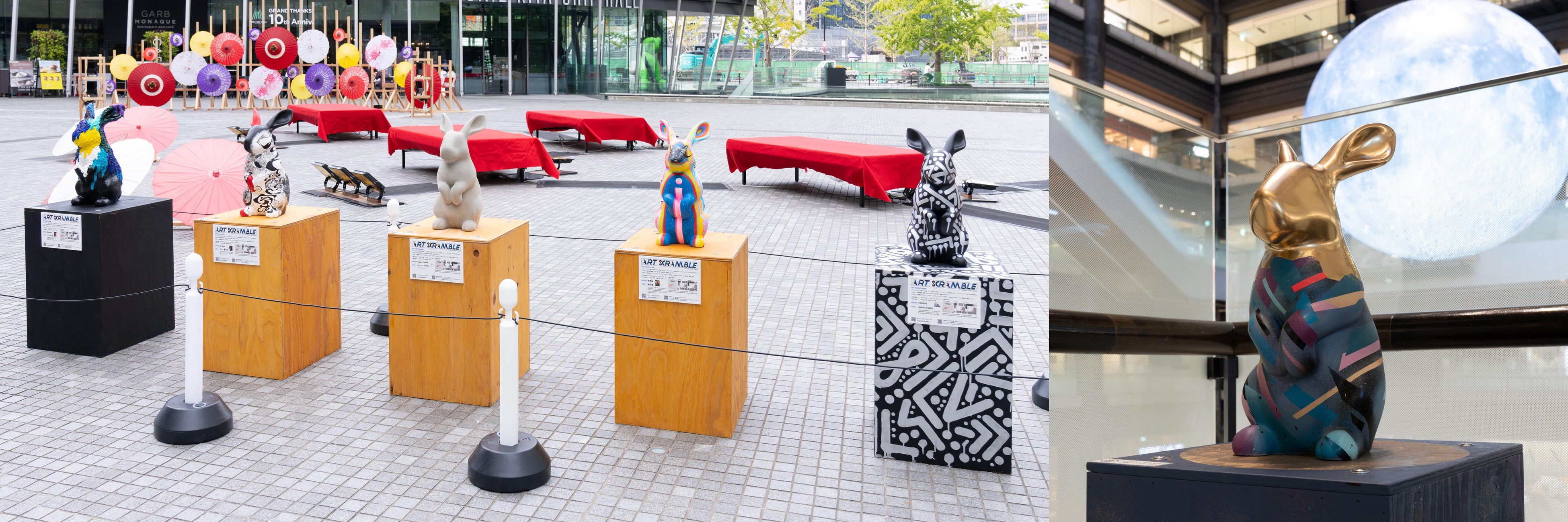 グランフロント大阪まちびらき10周年記念イベント第2弾「THE GRAND TSUKIMI」の開催にあわせ、「お月見」の象徴的なモチーフである「うさぎ」のオブジェ作品をうめきた広場、北館2階・4階に展示。10周年にちなみ10組のアーティストが制作した個性豊かな10作品を、まちを巡りながら楽しんでいただけます。