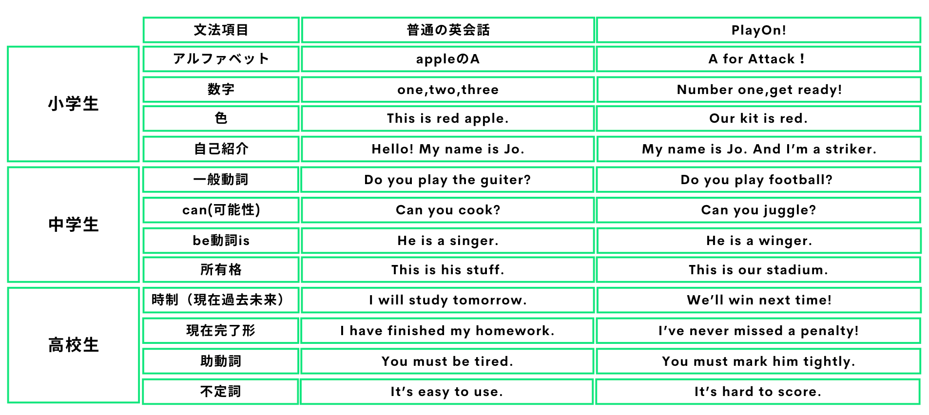 このように、小中高の学習指導要領に準拠した内容をベースに、必要な熟語や動詞をサッカーのリアルな文脈に置き換えることで、実践的かつ継続しやすい英会話学習を実現しています。