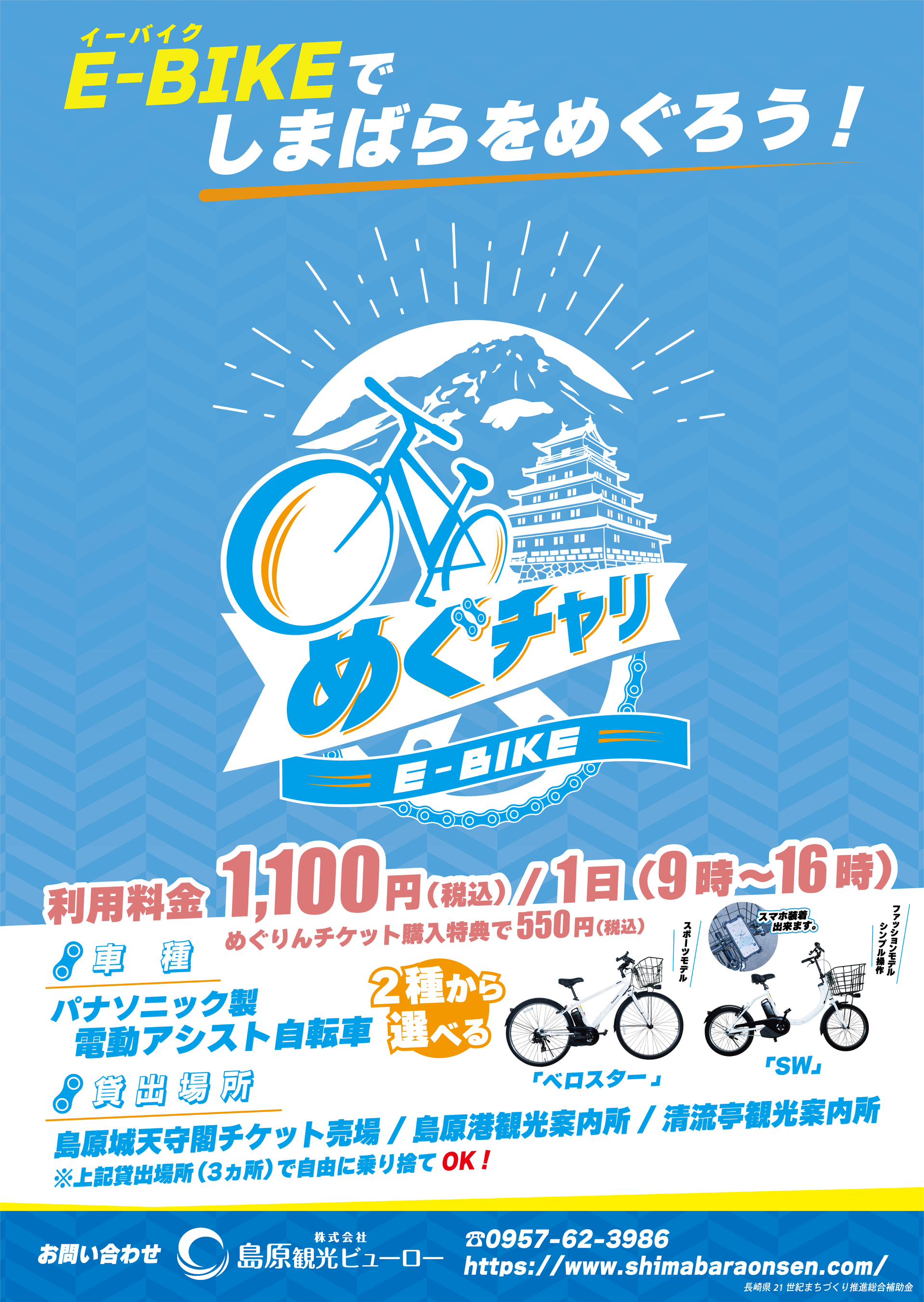 ㈱島原観光ビューローは、島原市内周遊観光の2次交通網整備として、長崎県の21世紀まちづくり推進総合補助金を活用した電動アシスト付自転車(E-BIKE)のレンタル事業「めぐチャリ」をスタートしました。