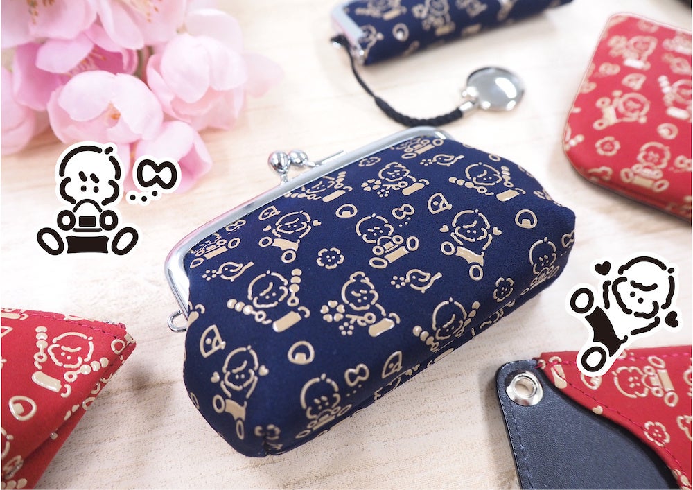 今回のオリジナル商品では、「春のお花見」をイメージしたむらまつしおりのデザインを甲州印傳の魅力である漆付けで表現。均一で美しい漆の立体感によって平面で描かれる「三頭身」に新しい息を吹き込みました。