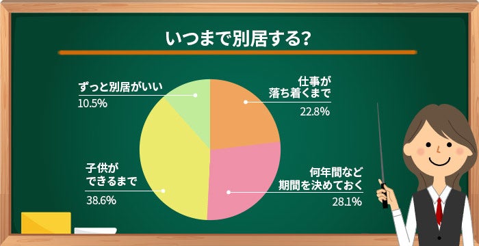 「ずっと別居がいい」という意見は1割程度に留まっていることから、別居婚には前向きでも、いずれは同居したいと考えている人が大多数だということがわかりました。