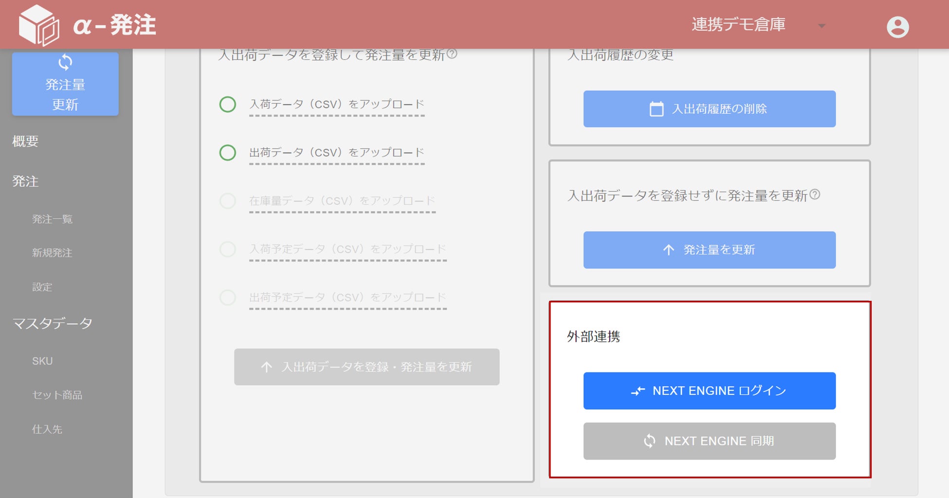 「α-発注」の「発注量更新」ページ内で「NEXT ENGINE 同期」ボタンを押下するとデータが連携され、自動で適切な発注リストが生成されます。