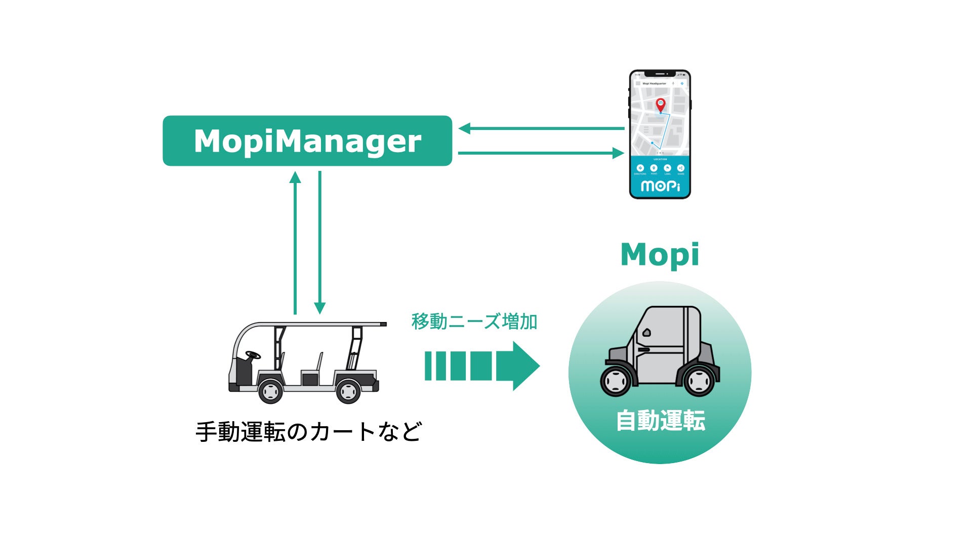 中山間部・離島や観光地などにおいて、すでに顕在化している移動ニーズを拾うだけでなく、店舗や観光・レジャー施設、そして病院や宿泊施設などの移動の目的地となる地域事業者と連携して、トリップ数(移動単位数)をKPIとして、地域住民や観光客に積極的な移動提案を行うことによって新たな移動ニーズを喚起すると同時に、地域参加による持続可能なビジネスモデルの構築に挑戦します。そして、MopiManagerは自動運転モビリティの運行システムとしてだけでなく、利用者の移動や購買行動などのデータを収集・分析して利用者へ移動提案を行うエンジンや、利用者や事業者のコンテンツを管理するCMSなどをそなえた地域MaaSのプラットフォームとして整備します。