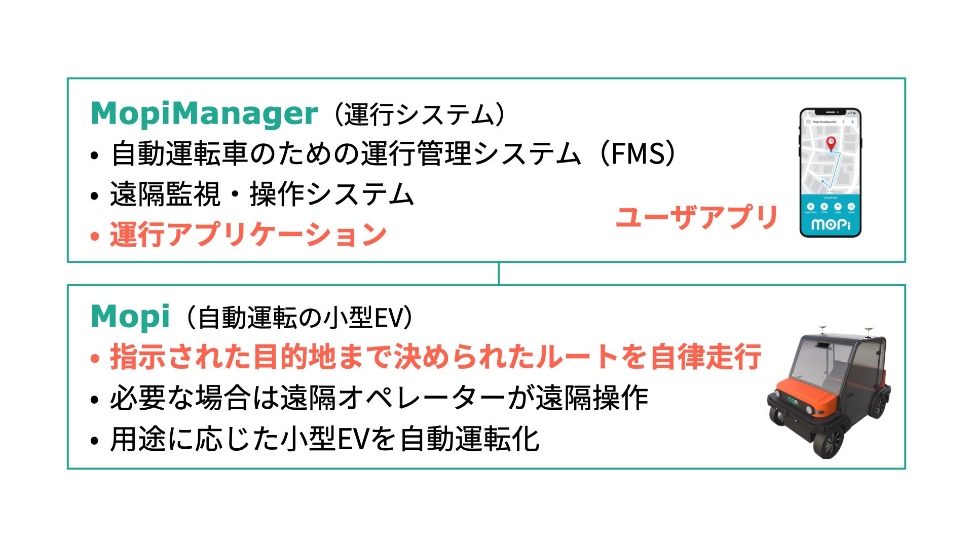 株式会社モピは、公共交通の縮小や高齢化によって移動困難者が増加した地域に、低コストな遠隔型自動運転システムを搭載した小型EV:Mopiを用いたマイクロモビリティを提供すべく、中山間部や離島などで実証実験を続けてきました。そのような地域においては、一定の輸送ニーズを束ねる必要がある乗合バスの形態ではなく、分散した移動ニーズにきめ細かく応えることができるデマンド型のモビリティが求められています。その実現に必要な、利用者からのリクエストに応じて自動的な配車などを行う運行管理システムや、遠隔監視・操作システムなどを統合した、運行システム:MopiManagerの開発を続けています。