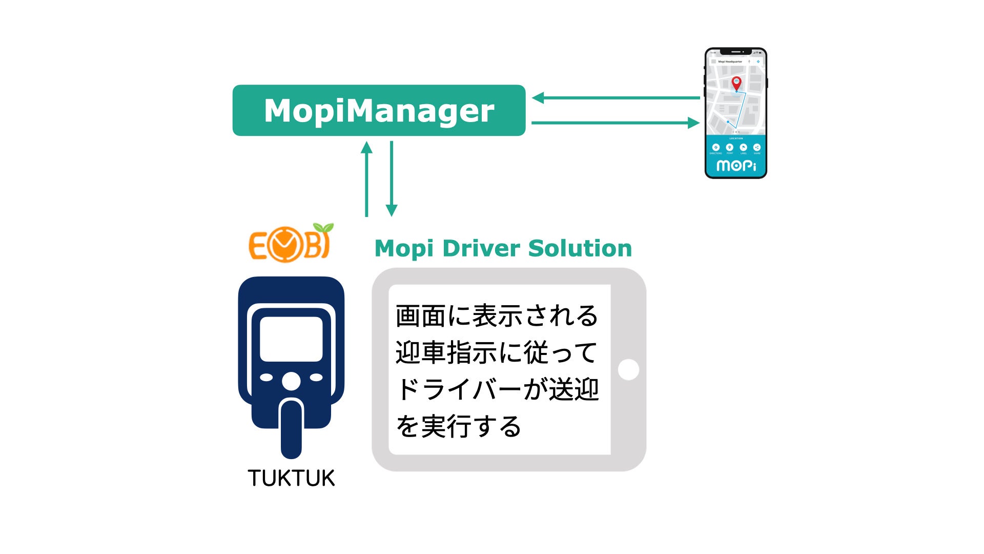 まず、MopiManagerの手動運転用の車載システム:DriverSolutionを搭載した電動トゥクトゥク(手動運転)による、デマンド型のマイクロモビリティの社会実装を目指します。3人乗りの電動トゥクトゥクは、ドライバー以外に2名の乗客を送迎することができます。利用者がスマートフォンアプリで送迎依頼をすると、MopiManagerは最短で送迎が可能な車両を選択して送迎の指示を送ります。その指示は、DriverSolutionのタブレット画面に表示され、ドライバーはその指示に従って送迎を実行します。
