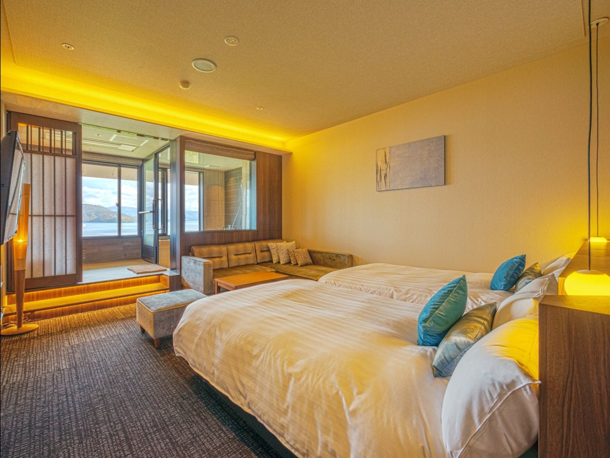 客室は、洋室ツイン(38㎡)11室・(46㎡)1室、洋室ダブル(32㎡)1室・(38㎡)3室に加え、デラックススイート(112㎡ 68畳)1室、プレミアムスイート(185㎡ 112畳)1室の全18室で構成されています。