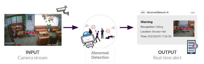※3 Asillaの特徴として、監視カメラが設置された箇所で起こる通常の行動を予め学習することで、そこから逸脱した行動のみを検知対象として画像解析を実施します。これにより、AIシステムのコアにおける処理を軽量化し、エッジデバイスでの運用を可能にします(Jetson nanoでカメラ1台、NXで3台まで一括処理可能)。例えば、オフィスビル、大型商業施設などの大規模施設において、サーバ1台で最大80台のカメラ映像を一括処理することが可能です。