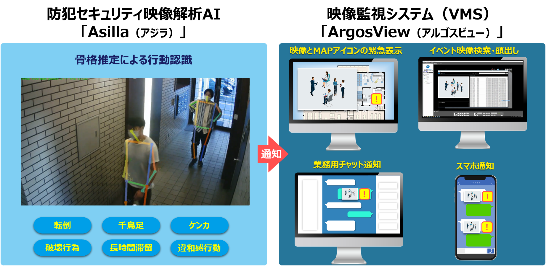 映像監視システム(Video Management System、以下VMS)の国内市場5年連続No.1※1メーカー、パナソニック ネットソリューションズ株式会社(以下 パナソニックNETS)と、行動認識AIを用いた防犯セキュリティ向けソリューションを提供する株式会社アジラ(以下 アジラ)は、異常行動の早期解決に向けて、VMS「ArgosView(アルゴスビュー)」と防犯セキュリティ映像解析AI 「Asilla(アジラ)」を連携しました。