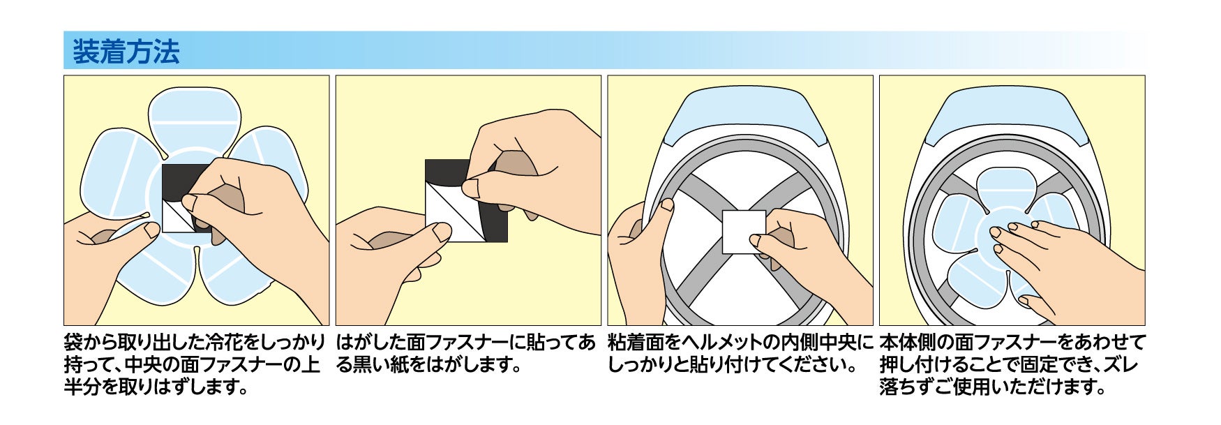 ワーク系初となるアイスヘッドパッド「REIKA」のもう一つの特徴は、ヘルメットへの取り付け・取り外しが可能な点。アイスヘッドパッドとヘルメットへそれぞれ面ファスナーを取り付けることで、ヘルメット内でずれることなく使用することができる。もちろん、ヘルメットだけではなく、キャップへの取り付けも可能で、様々な場面での屋外作業時の強い味方になる。