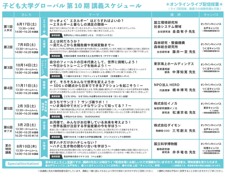 子ども大学グローバルは、1回きりの学びで終わるのではなく、1年間を通して、様々な領域を学ぶことができる講義ラインナップとなっています。第10期のラインナップは、環境学、土壌学、アントレプレナーシップ、国際学、自然科学、宇宙学の世界など、多様な分野から先生をお招きします。これまで9期にわたって、延べ100名の専門家の先生にご登壇いただき、15,000人を超える親子に講義を受講していただきました。楽しくワクワクする学びを、日本全国、海外からでも学ぶことが可能です!