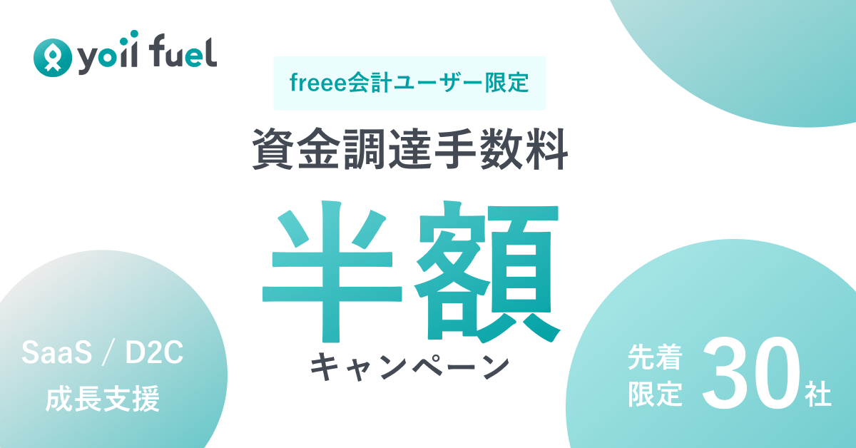 株式会社Yoii(ヨイ、本社:東京都渋谷区、代表取締役CEO:宇野雅晴)は、レベニュー・ベースド・ファイナンス(RBF)プラットフォーム「Yoii Fuel」において、freee会計を利用中のお客様を対象に手数料半額キャンペーンを開始しましたのでお知らせいたします。尚、本キャンペーンは先着30社限定、実施期間は9月8日までの1ヶ月間となります(詳細:https://yoii.jp/freee-promotion)。
