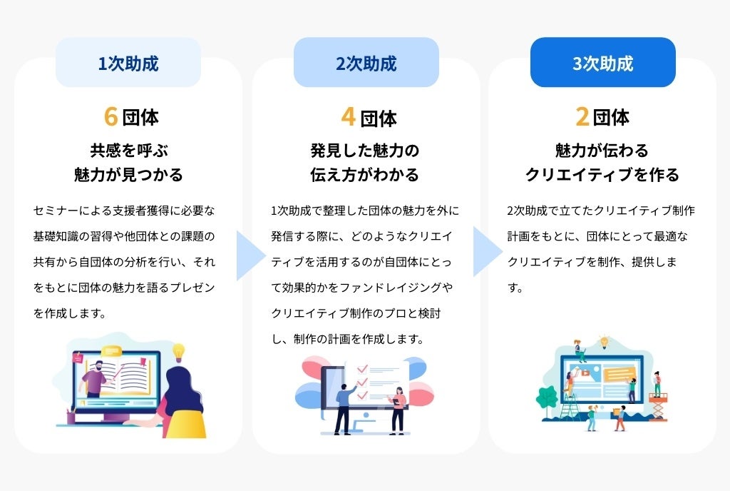 SOCIALSHIP2023では、昨年度と同様に1次から3次までの段階的な助成を設け、ファンドレイジング強化とクリエイティブを助成いたします。