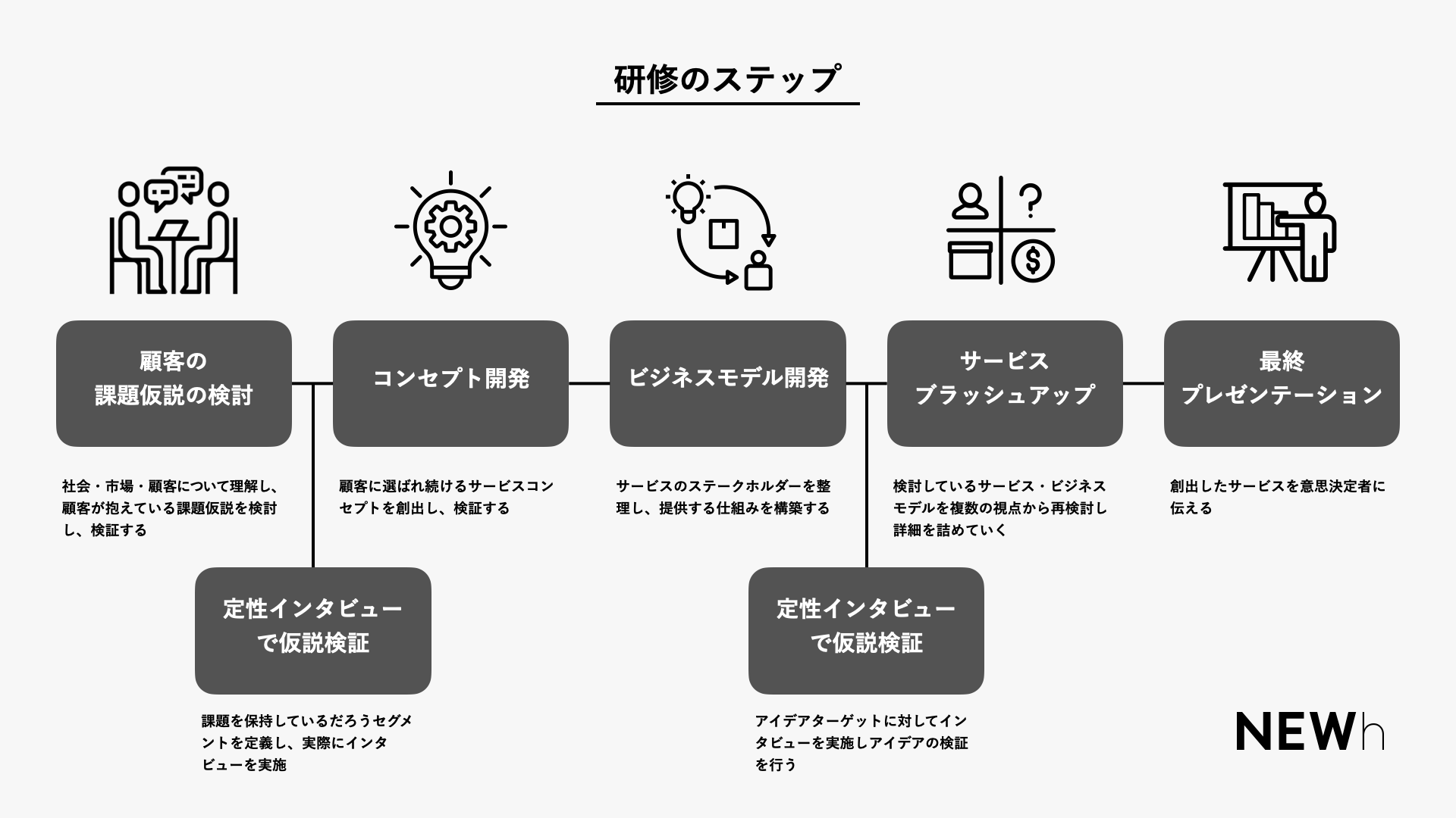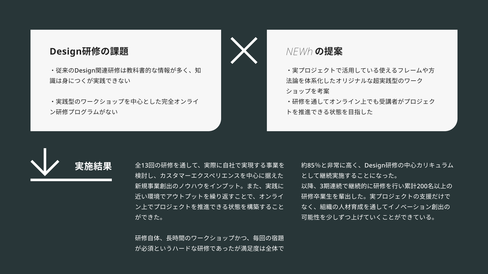 NEWhがこれまでの実プロジェクトの経験をもとに体系化した独自ノウハウ・フレームワークを活用した、実践型の研修を考案しました。また、オンラインツールを活用した完全オンラインでのワークショップで、ツール活用に慣れてない人でも研修を通して、実際の現場で使える状態をつくり、これまでに200名以上の研修を行い、年間を通して人材育成の中心的カリキュラムになりました。