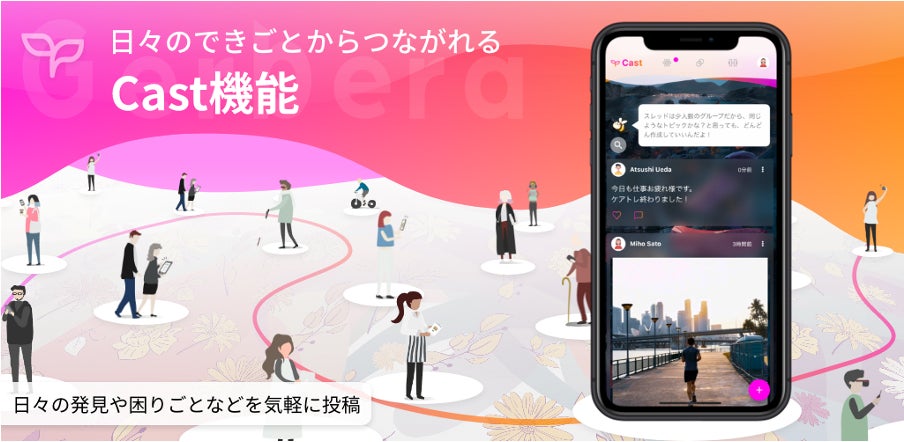◆日々のできごとからつながれる「Cast(キャスト) 機能」Cast機能では、日々の発見や困りごとなどを気軽に投稿できます。投稿には共感や返信などの反応ができますが、その反応は第三者に見えない仕組みとなっています(返信は個別メッセージ形式)。特定の誰かにスポットライトがあたらずに個々がつながりやすくなるように、共感を多く集めるのではなく、大切なつながりを見つける世界を目指しております。