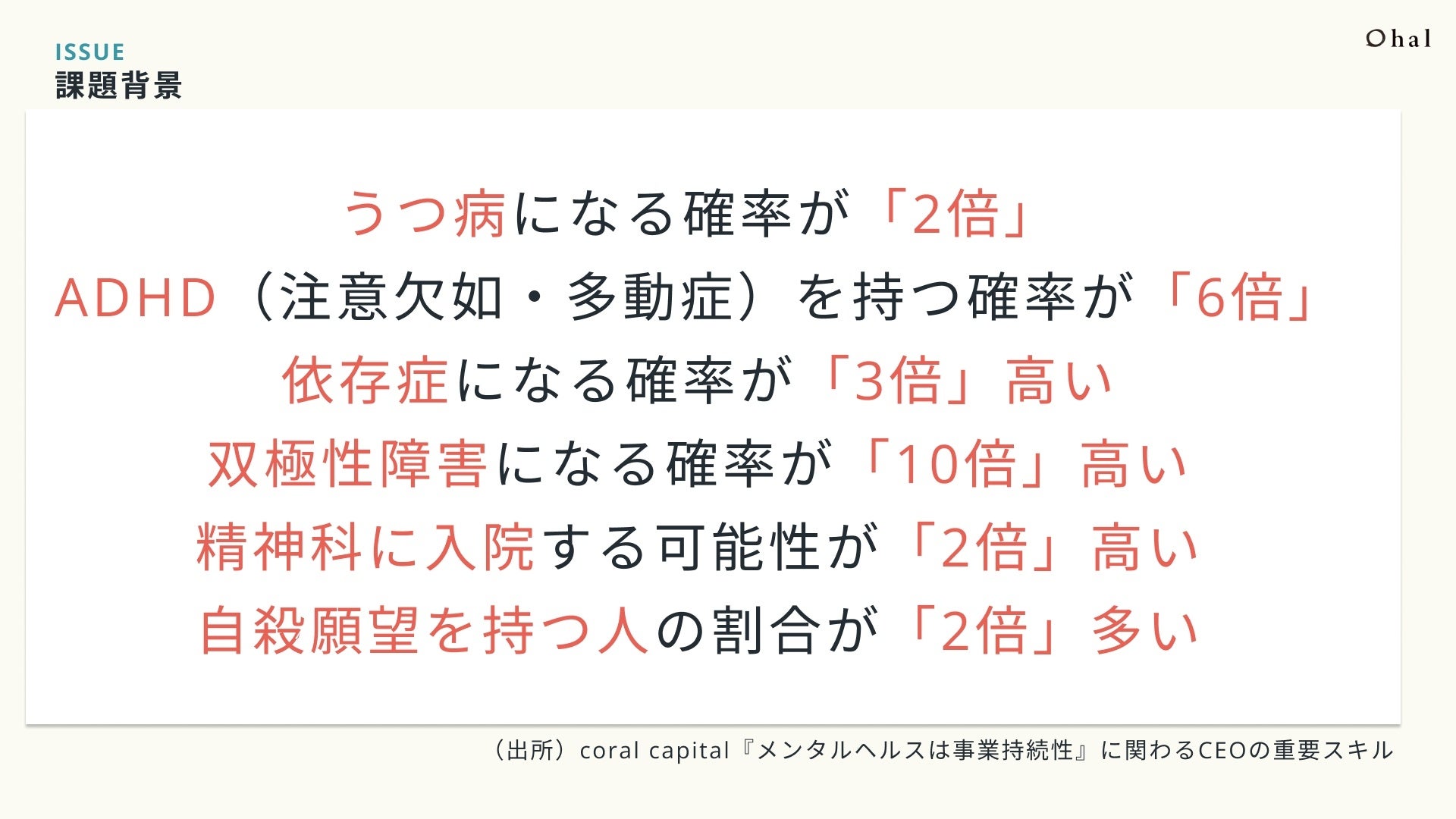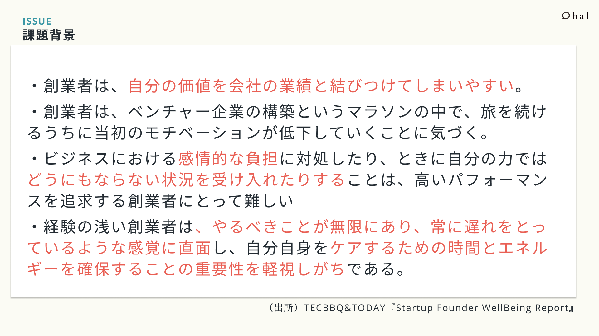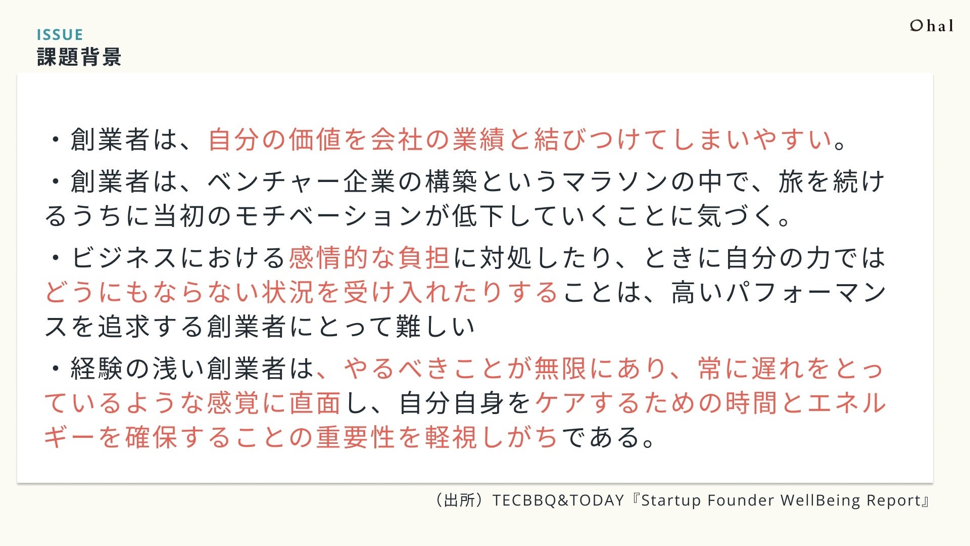 創業者の高すぎるメンタルヘルスリスクについて言及されて久しいです。創業者であり、社会課題解決における重責も追う起業家は殊更メンタルダウンリスクが高いと考えられます。