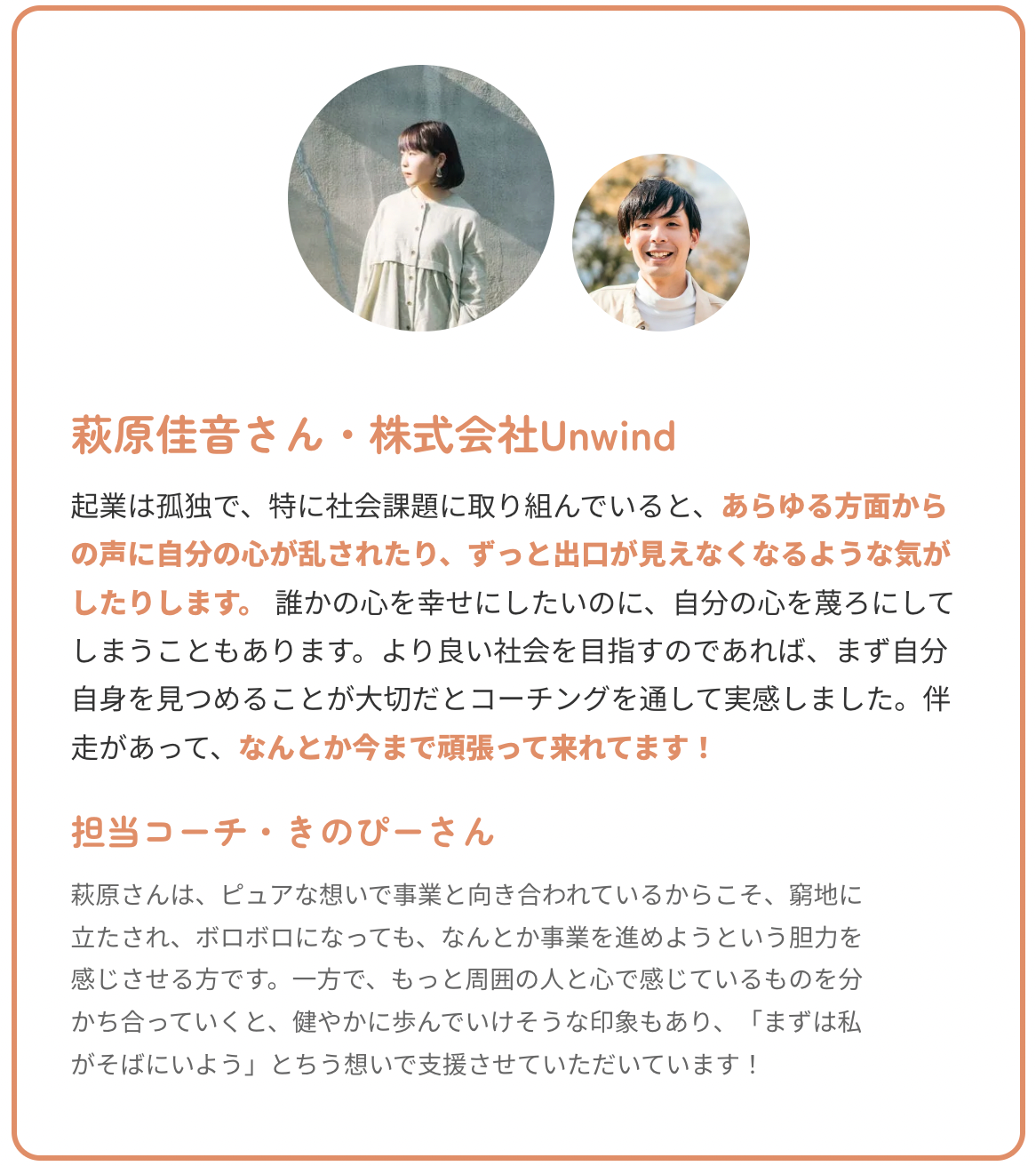 リスクとポテンシャルを兼ね備えた創業者に対する支援を、心理的に・ビジネス面で・社会的インパクトへ向けて支援していきたいという想いでSocial Coachingは始まりました。