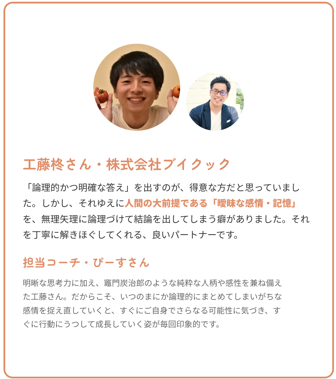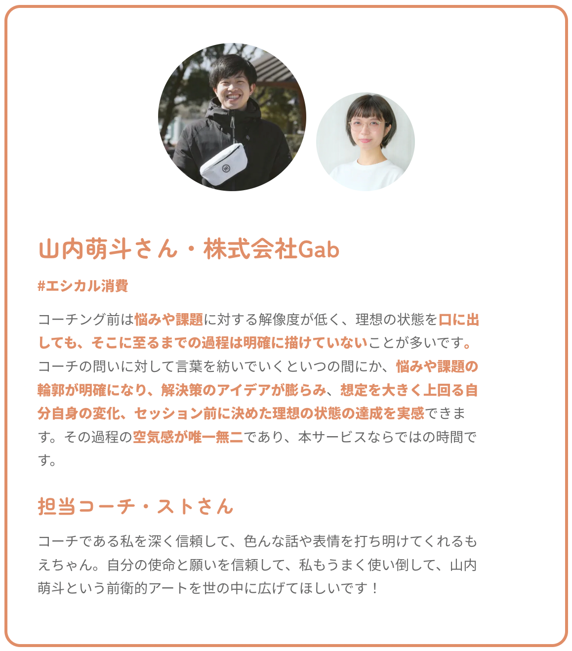 社会性と経済性や理想と現実など、様々な対立に引き裂かれそうになることが私自身あります。コーチという相棒。Social Coahingという相棒。受け手である起業家同士という相棒。本サービスを通して、やさしくて孤独な挑戦者が世界で一番報われる世界にしていきたいです。