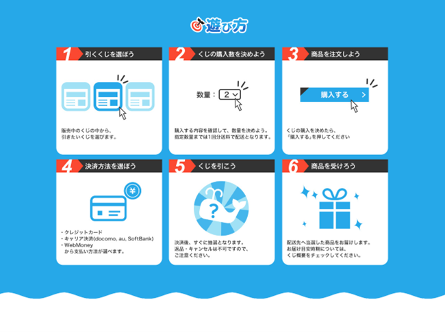 スマホやPCからいつでも簡単に楽しめるハズレなしのオンラインくじサービスです。WEBサイトから・オンラインショップのように・手軽に・ハズレ無しで・何回でも・ここだけの商品が・ご自宅まで商品配送されます。