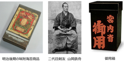 明治天皇が京都へ還幸される際の東都土産に何かないかと山岡鉄舟から相談を受けた二代目は、ただの焼海苔を出しても面白くないからと、味附海苔を苦心創案。