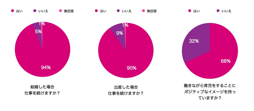 - 女子学生の90%が「将来子どもを産んだ場合仕事を続けたい」と回答。しかし、「子どもを持ちながら働くことにポジティブなイメージを持っている」と答えた割合は68%と減少