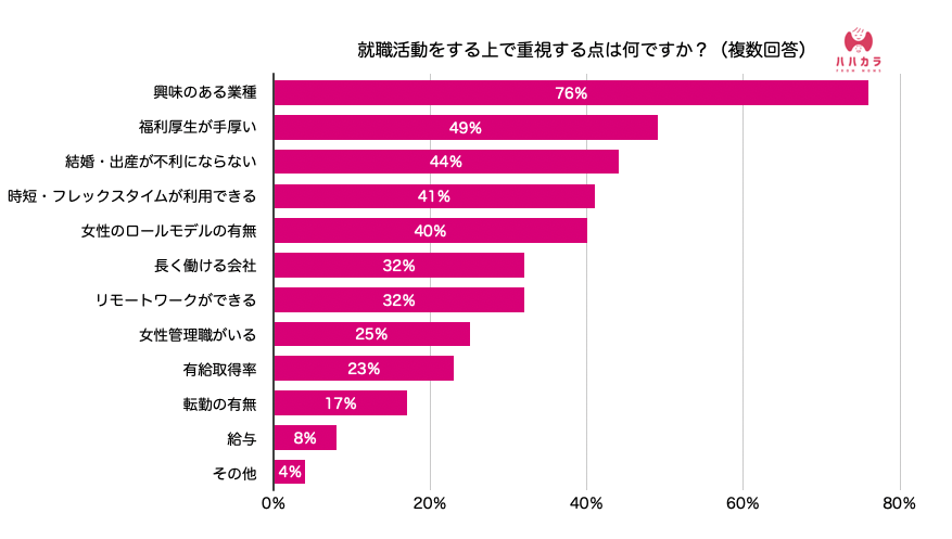 就職活動において重視する点は何かと言う質問に対して、「興味のある業種」が76%と最も多い回答でした。さらに「福利厚生が手厚い」が49%、「結婚・出産が不利にならない」が44%、「時短・フレックスタイムが利用できる」が41%と、社内制度や柔軟な働き方を重視する傾向が見られました。新卒時の就職活動という早い段階から、仕事とライフイベントの両立を見据えながらキャリアを積んでいきたい女子学生が多いことがわかります。また、「女性のロールモデルの有無」が40%、「女性管理職がいる」が25%と、ライフワークバランスを維持しながら「女性」として働くことが想像しやすいか、また入社後身近にロールモデルがいるのかどうかも重要視されています。