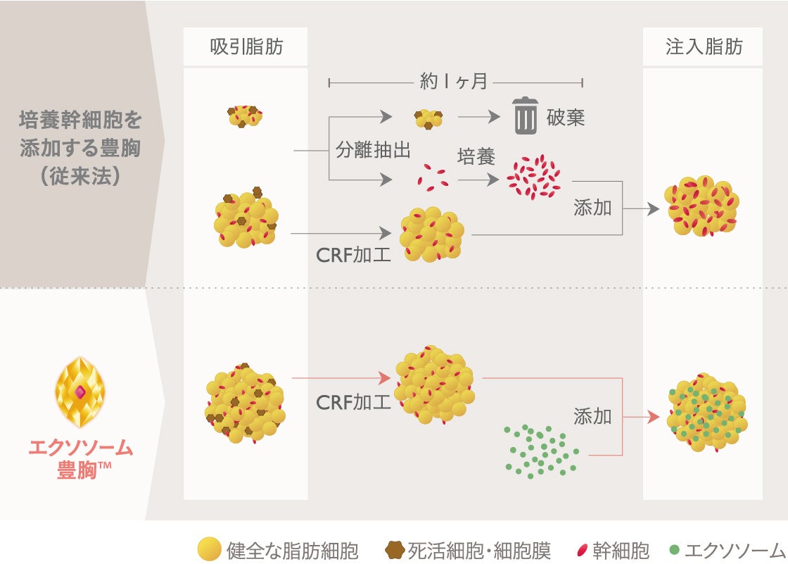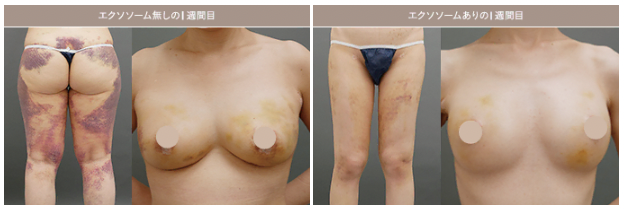 エクソソームは損傷を受けた細胞に集まり、修復を促すように働きかける性質があります[4]。また、そのサイズは極めて小さく、血流を介して全身に到達できます。こうしたことから、エクソソームを添加することで、バストのみならず、脂肪吸引部位のダウンタイム症状(むくみ、内出血など)の軽減が期待できます。
