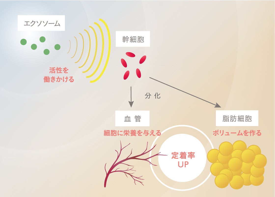 脂肪の定着・再生率を上げるためには、バストの血流を増やし、脂肪が生き残りやすい環境を整えなけれななりません。エクソソームは、こうした環境づくりの起点となる物質です。エクソソームが脂肪中の幹細胞に働きかけることで幹細胞の分化が活発になり、その結果、脂肪が生き残るために必要な血管の新生と、脂肪細胞への分化が促進されます。