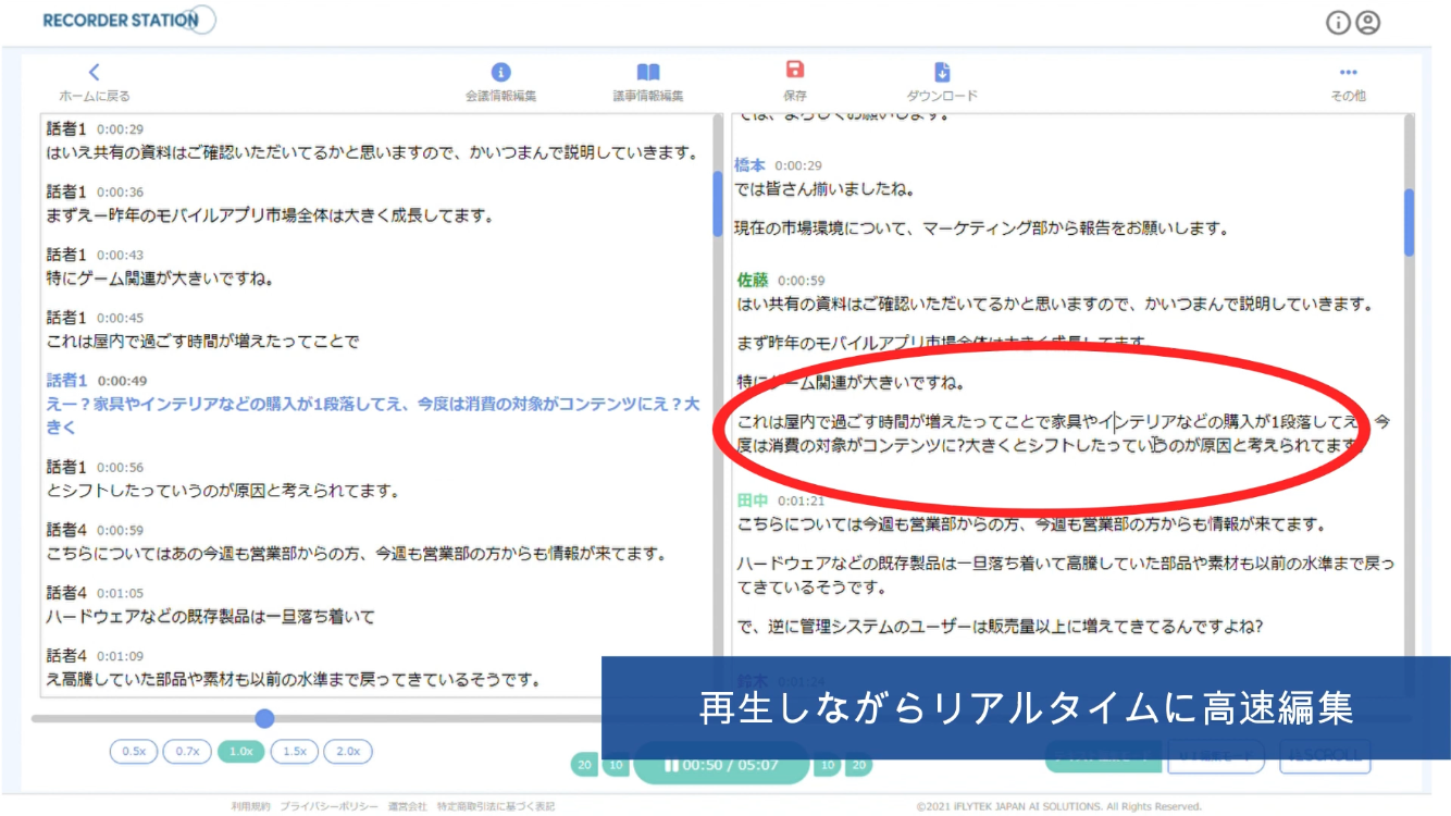RECORDER STATIONの編集画面は、左側にVOITERで文字起こしした内容の原文が表示され、右側には文字起こしした内容の編集ができます。