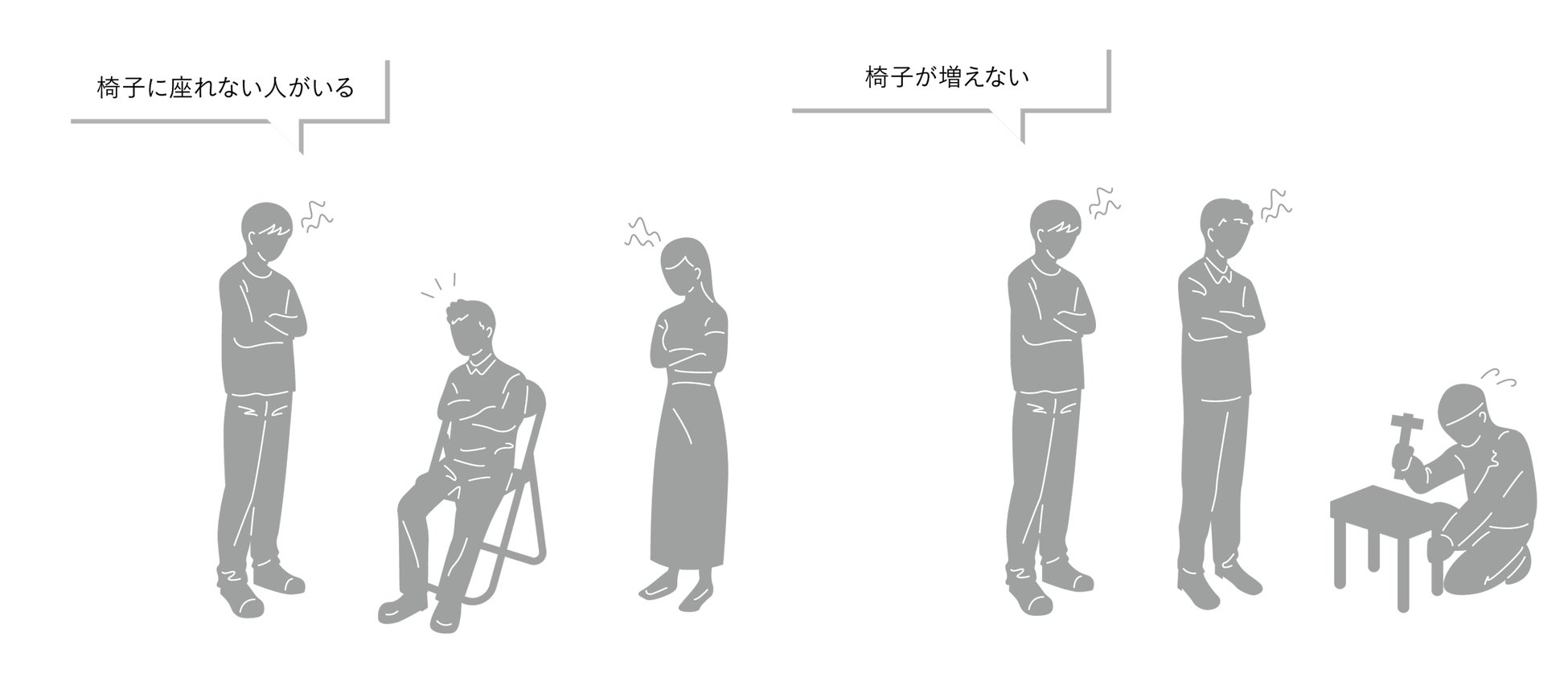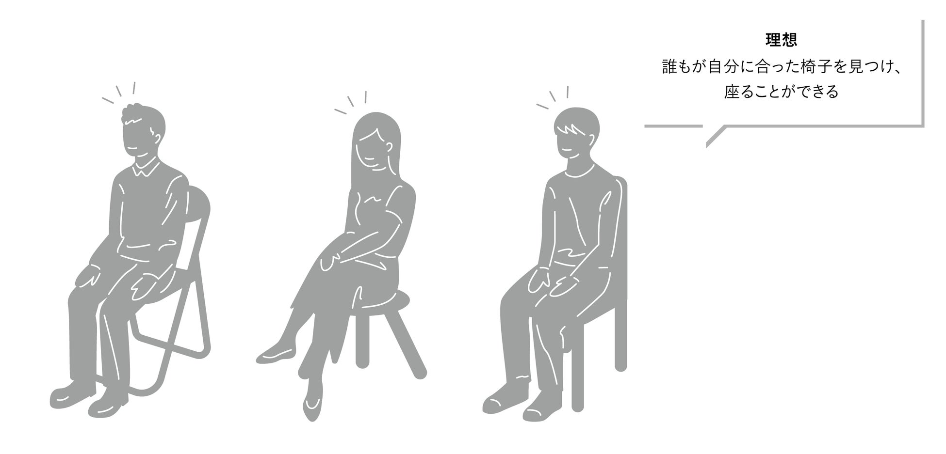 この問題が引き起こすのは、社会人の約8割が陥るといわれる"キャリア迷子”の問題、学歴と収入格差の問題、生産性の低さの問題、自己肯定感の低さの問題など様々です。現状の機会均等の限界を解決し、全ての人の個性に合わせて、最適なタイミングでその人にあった椅子(=機会)を提供する空間を目指します。