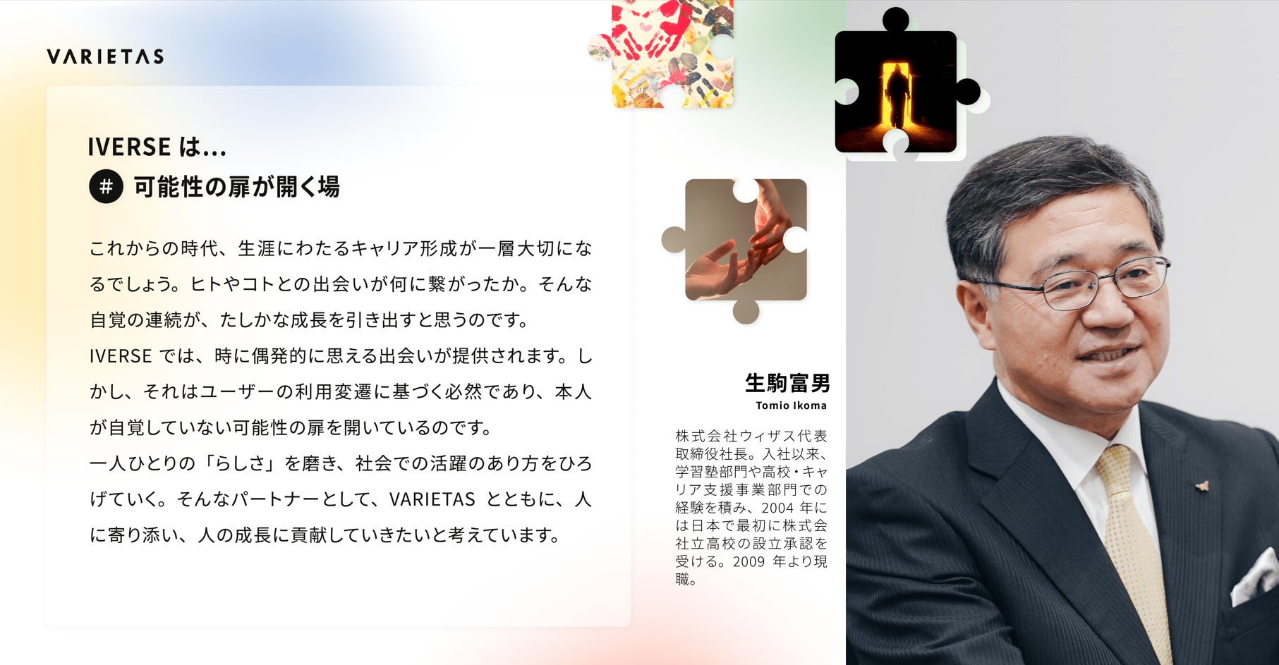 「IVERSE(アイバース)」を開発する株式会社VARIETAS(バリエタス、以下VARIETAS)は、2021年11月に行ったシードラウンド資金調達に続き、2度目となる資金調達をプレシリーズAラウンドにて実施いたしました。引受先は、学習塾の第一ゼミナール、通信制高校の第一学院高等学校を運営している株式会社ウィザス(以下ウィザス)です。リアルな場所で得られる知見を活かしながらソフトウェア開発を加速させるため、ウィザスが持つ様々なリソースを活用していくことを前提に、業務提携契約の締結も完了しております。