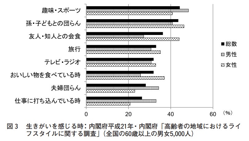 内閣府が全国の60歳以上の男女5,000人を対象に実施した「高齢者の地域におけるライフスタイルに関する調査(平成21年)」では、生きがいとして挙げられた上位7項目のうち4つが、団欒や食事に関することでした。