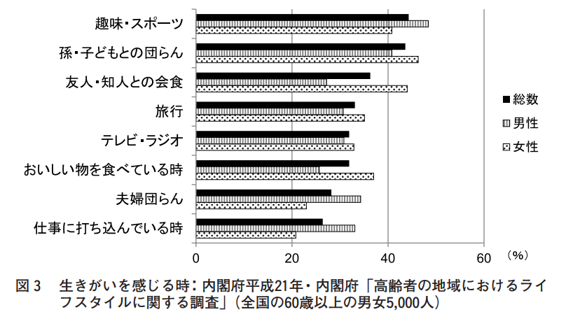 内閣府が全国の60歳以上の男女5,000人を対象に実施した「高齢者の地域におけるライフスタイルに関する調査(平成21年)」では、生きがいとして挙げられた上位7項目のうち4つが、団欒や食事に関することでした。