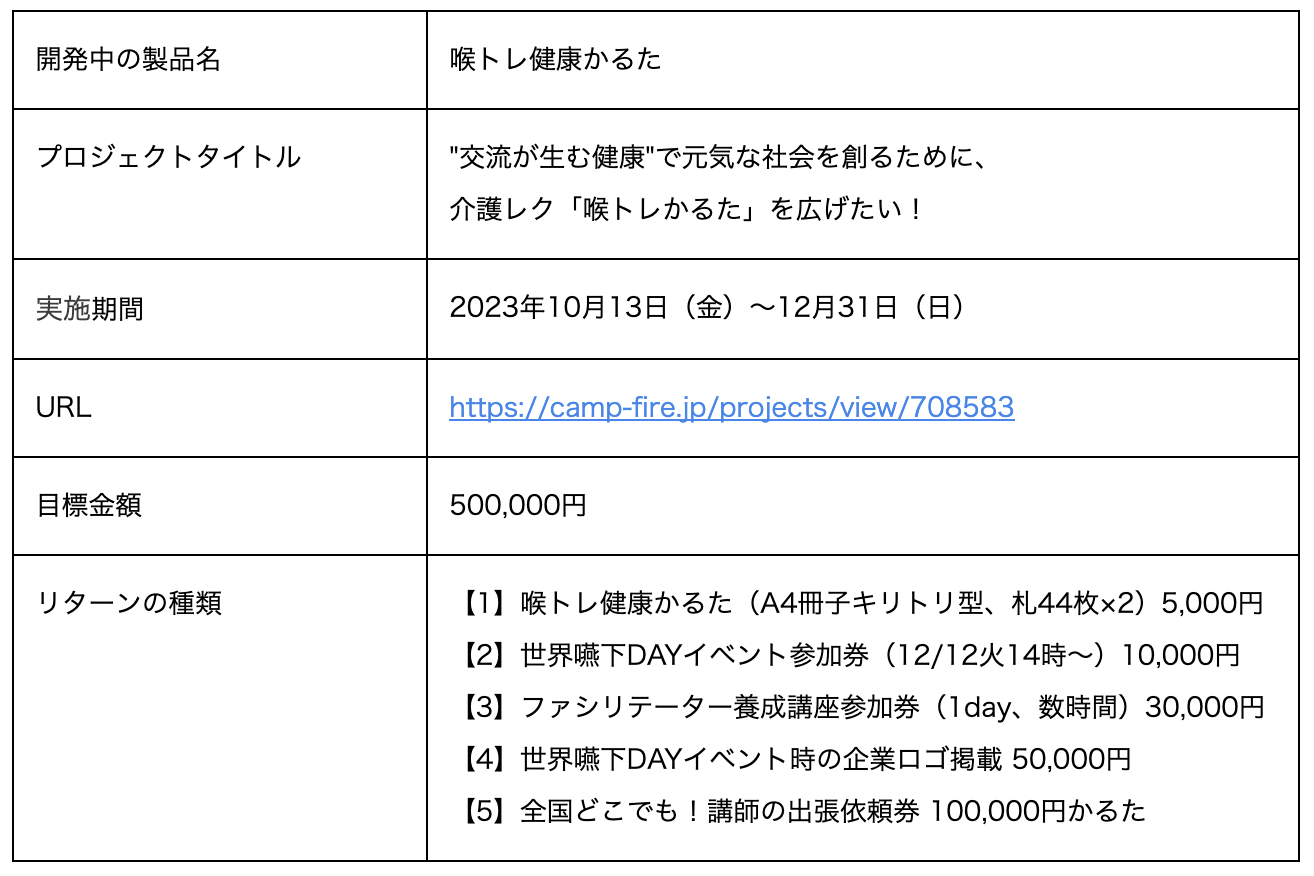 リターンの種類 | 【1】喉トレ健康かるた(A4冊子キリトリ型、札44枚×2)5,000円 【2】世界嚥下DAYイベント参加券(12/12火14時〜)10,000円 【3】ファシリテーター養成講座参加券(1day、数時間)30,000円 【4】世界嚥下DAYイベント時の企業ロゴ掲載 50,000円 |